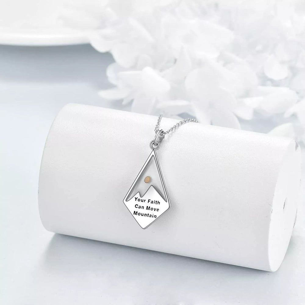 Elegantes Design: Dieser dreieckige Anhänger zeigt ein schillerndes Bergmotiv mit einem darin eingeschlossenen Senfkorn, das Glauben und unendliche Möglichkeiten symbolisiert. Die Rückseite des Anhängers trägt die Inschrift „Dein Glaube kann Berge versetzen“, was seine inspirierende Botschaft unterstreicht.