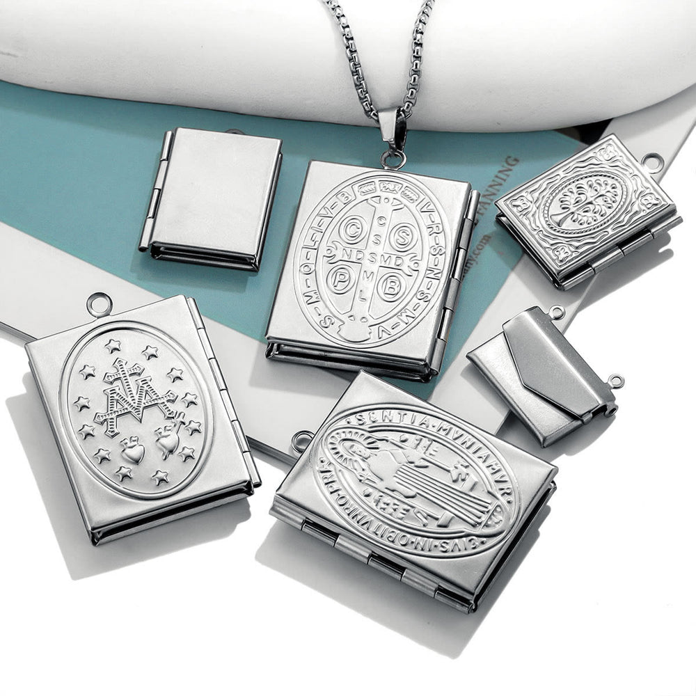 Heilige Designs: Jeder Fotobox-Anhänger zeigt sorgfältig gestaltete religiöse Symbole wie die Benedikt-Medaille, die Wundertätige Medaille und andere christliche Motive. Diese detaillierten Designs unterstreichen nicht nur Ihren Glauben, sondern bieten auch eine tröstende spirituelle Präsenz.