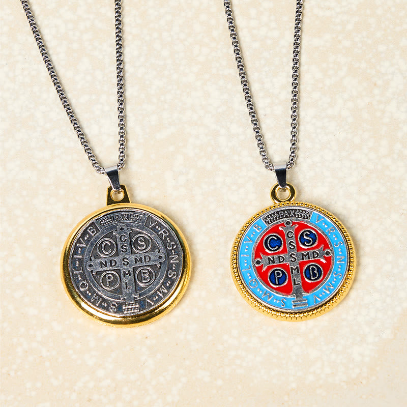 Doppelseitiges Design: Jedes Medaillon präsentiert zwei wunderschön detaillierte Seiten – eine zeigt den Heiligen Benedikt in all seiner Pracht, die andere trägt das mächtige Benediktkreuz. Wählen Sie zwischen markanten schwarzen oder leuchtend roten Akzenten, passend zu Ihrem persönlichen Stil.