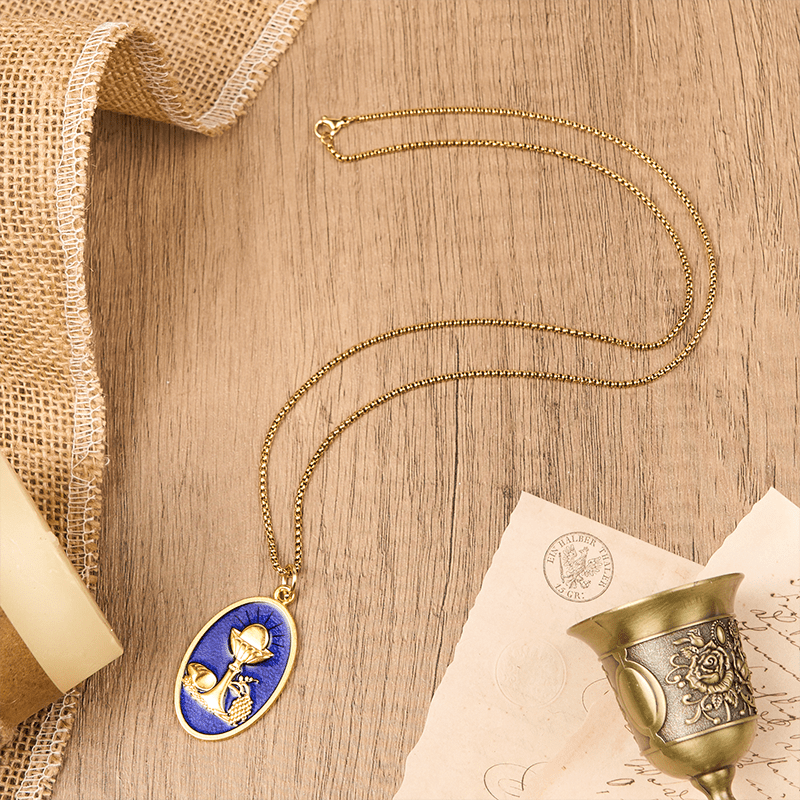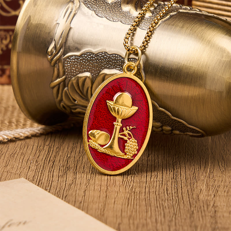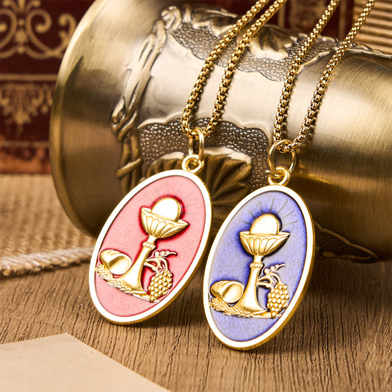 Die Kette besticht durch einen atemberaubenden Anhänger, der den eucharistischen Kelch, die Hostie, den Weizen und die Weinrebe – Symbole für Leib und Blut Christi – darstellt. Diese Elemente sind aufwendig in Goldtönen auf leuchtend rotem oder blauem Emaille-Hintergrund gestaltet und bilden einen markanten Kontrast, der ihre heilige Bedeutung unterstreicht. - Spirituelle Bedeutung