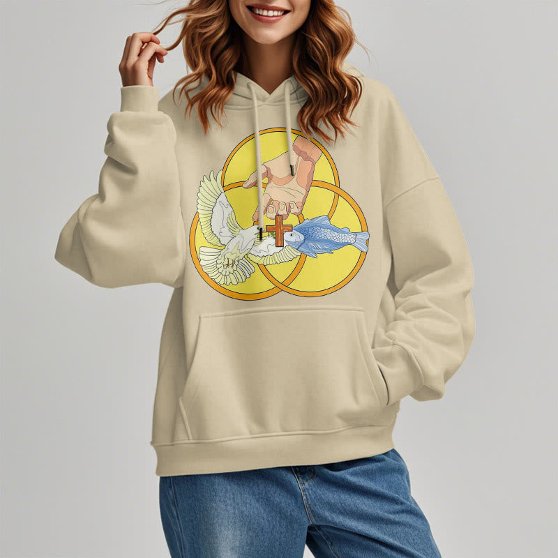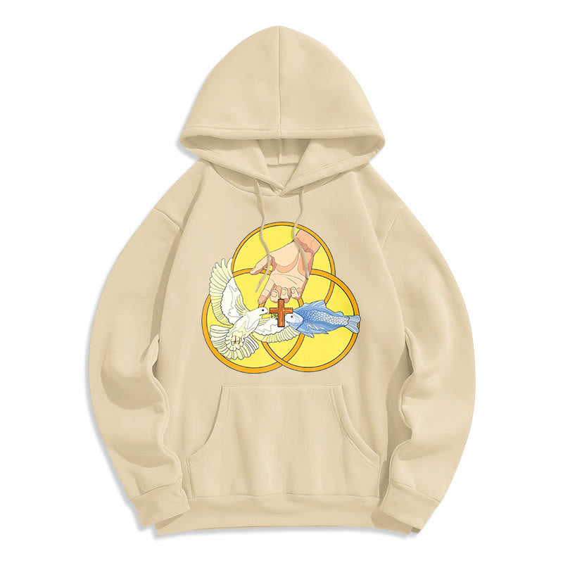 Christianartworkshop Farbiger Stil Das Kreuz-Emblem der Heiligen Dreifaltigkeit Fleece-gefütterter Polyester-Kapuzenpullover - Beige - 2XL - image 15