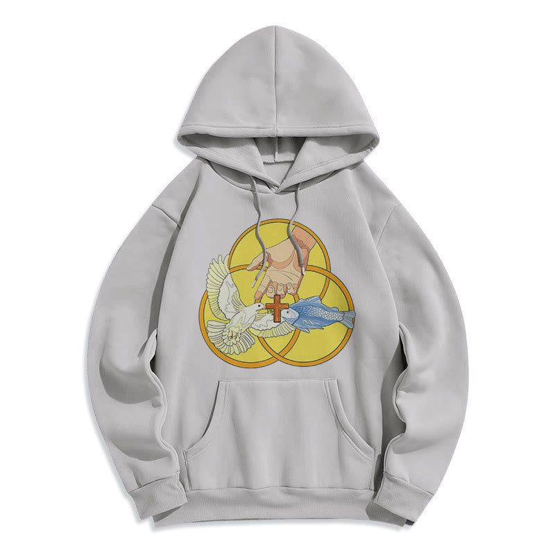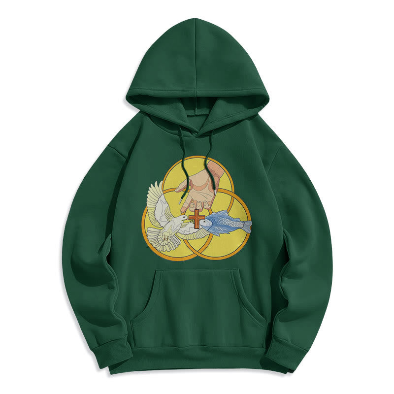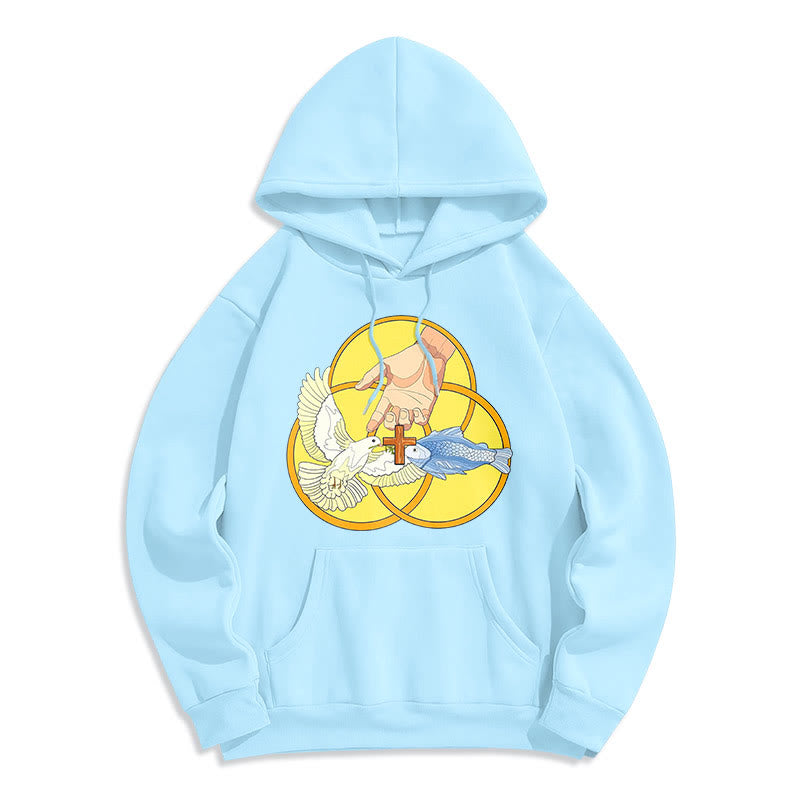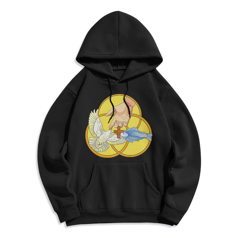Der Hoodie zeigt eine lebendige Grafik der Heiligen Dreifaltigkeit, die Vater, Sohn und Heiligen Geist symbolisiert. Das raffinierte und markante Design hinterlässt einen bleibenden Eindruck und repräsentiert Ihren Glauben auf optisch überzeugende Weise. Seine klaren Linien und leuchtenden Farben lenken die Aufmerksamkeit auf die tiefe Botschaft göttlicher Einheit und spiritueller Stärke.