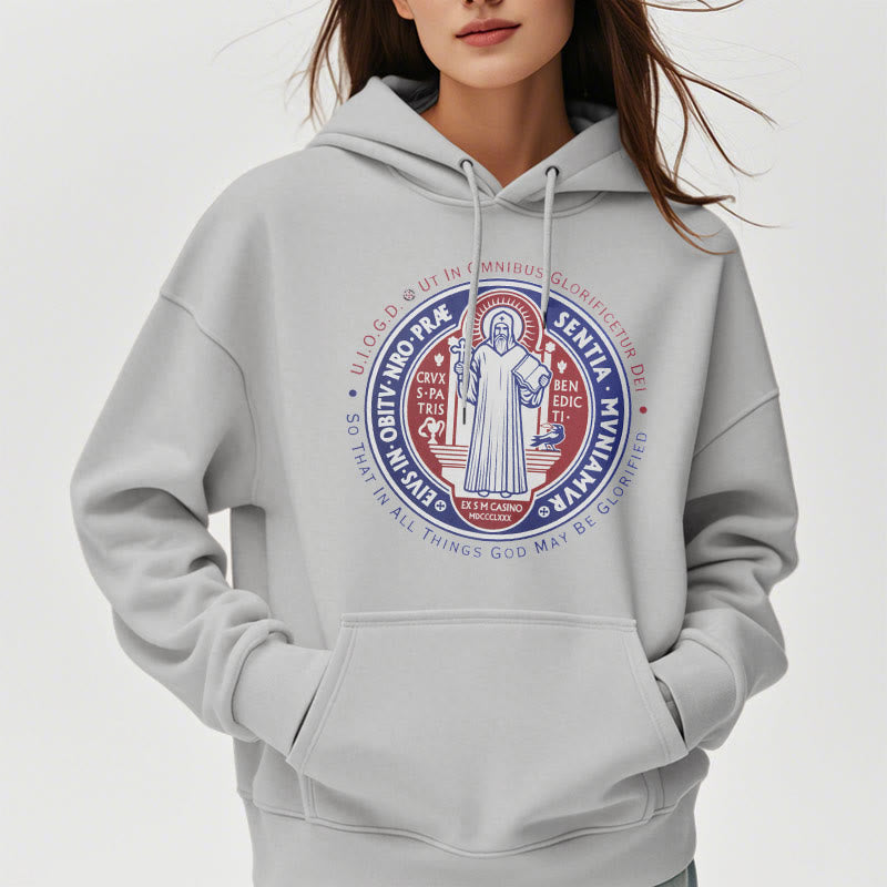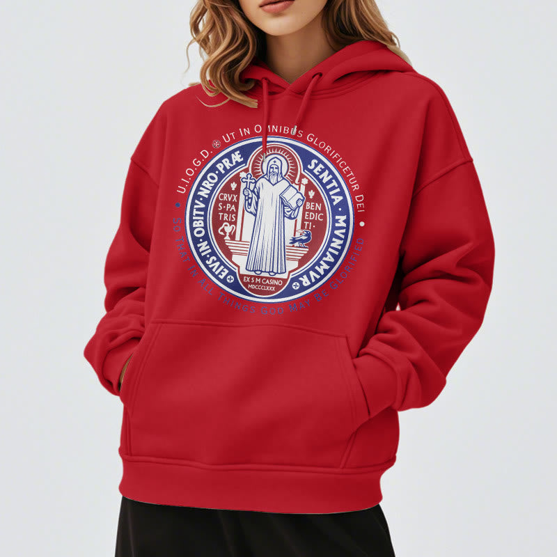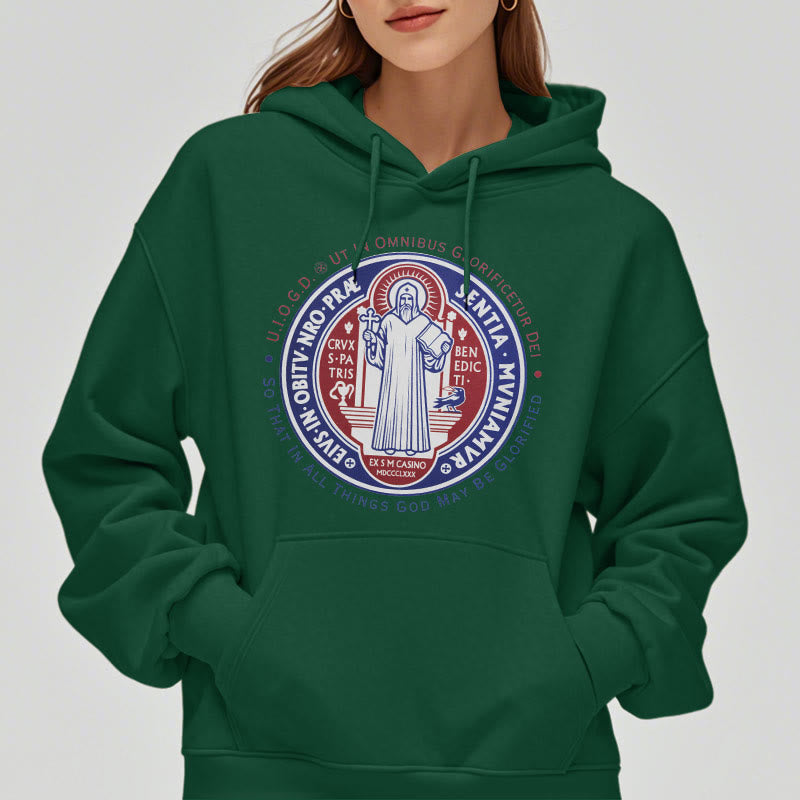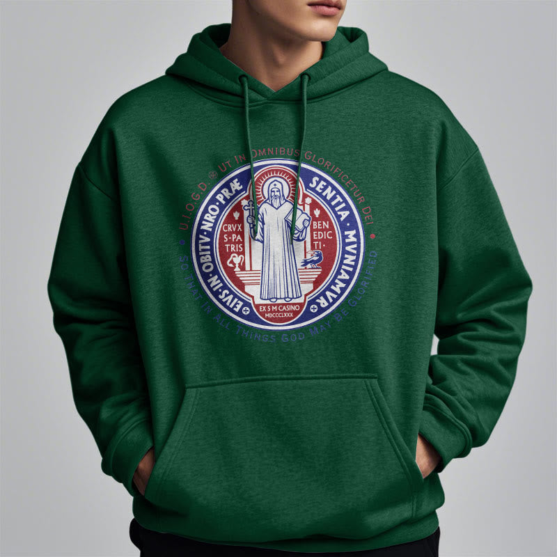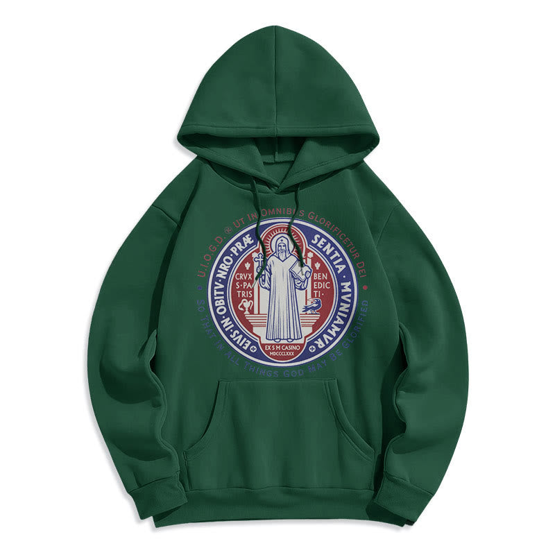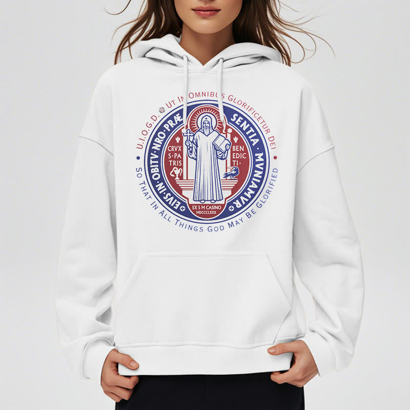 Christianartworkshop Klassischer farbiger Stil St. Benedikt-Medaillenemblem Fleece-gefütterter Polyester-Kapuzenpullover