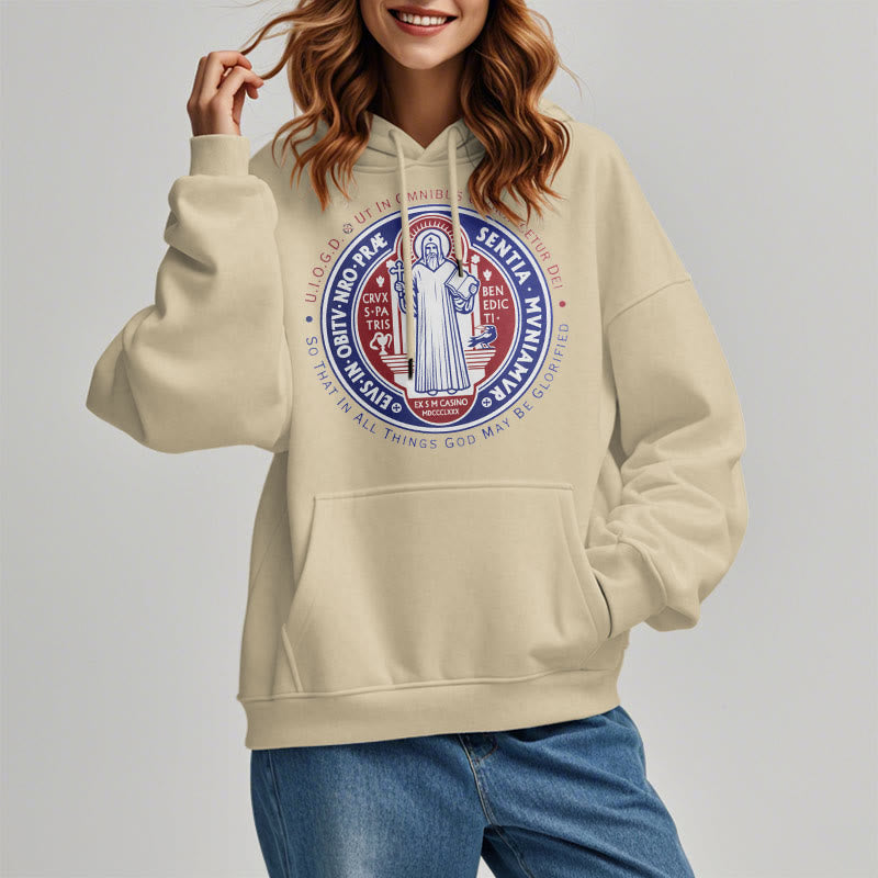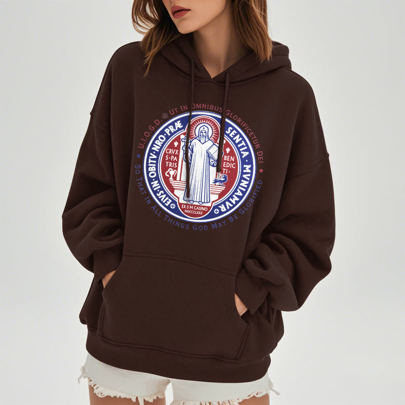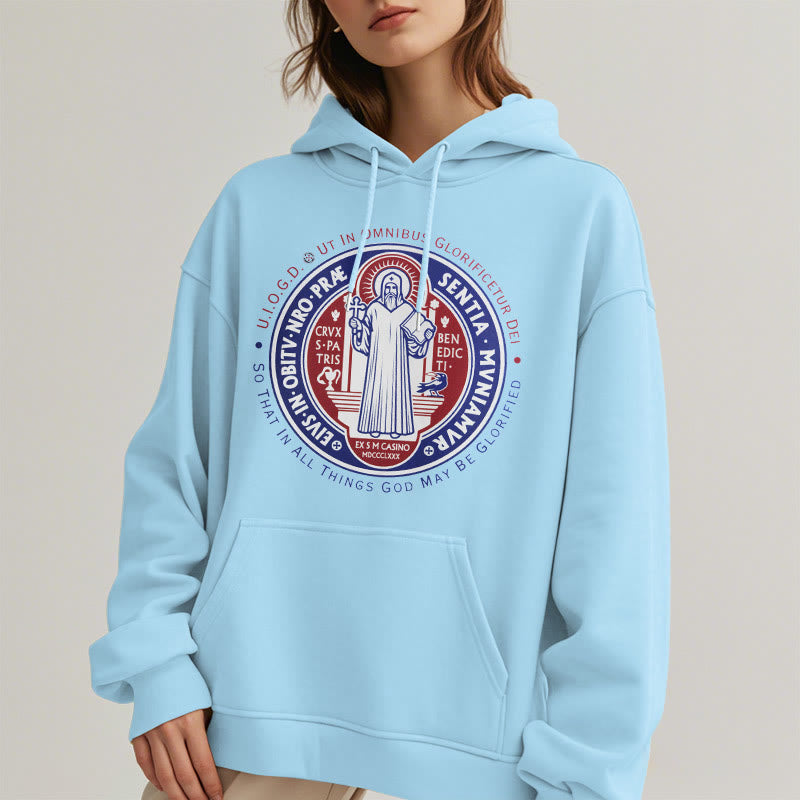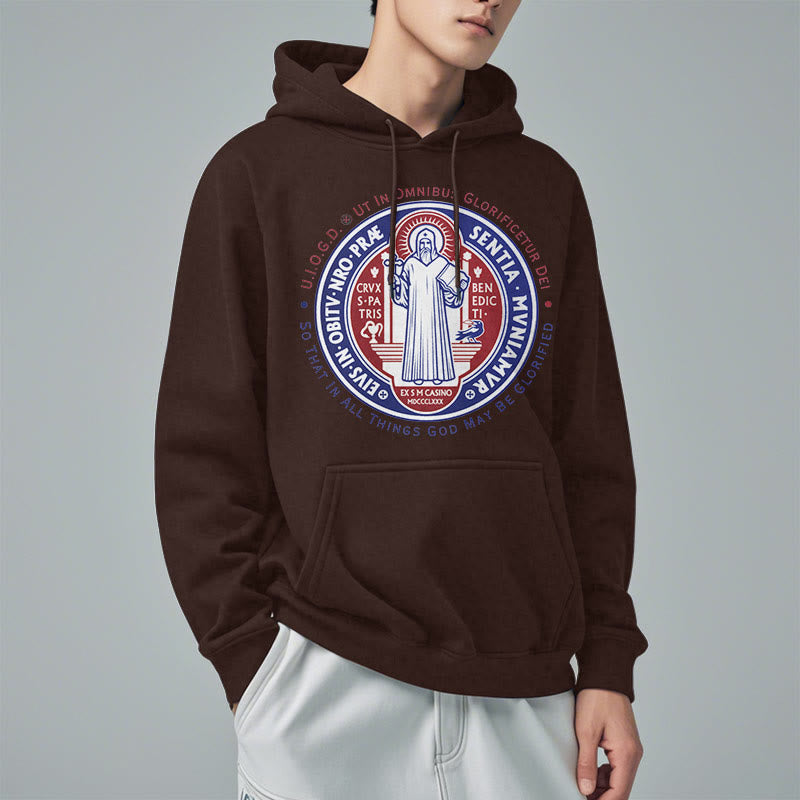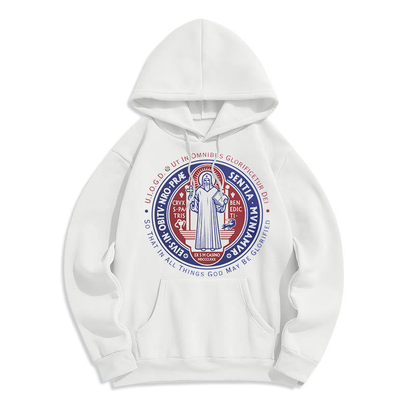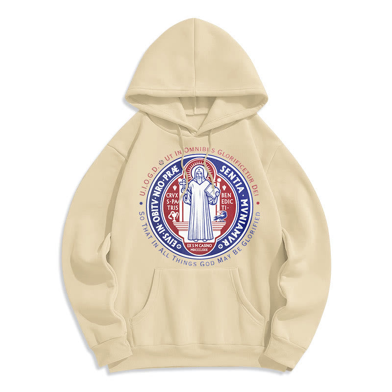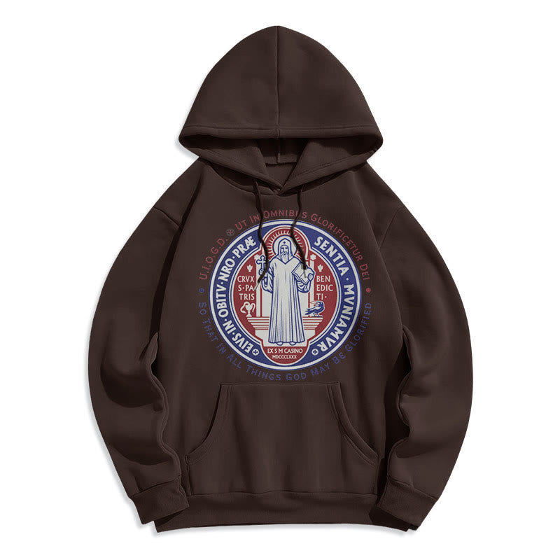 Christianartworkshop Klassischer farbiger Stil St. Benedikt-Medaillenemblem Fleece-gefütterter Polyester-Kapuzenpullover