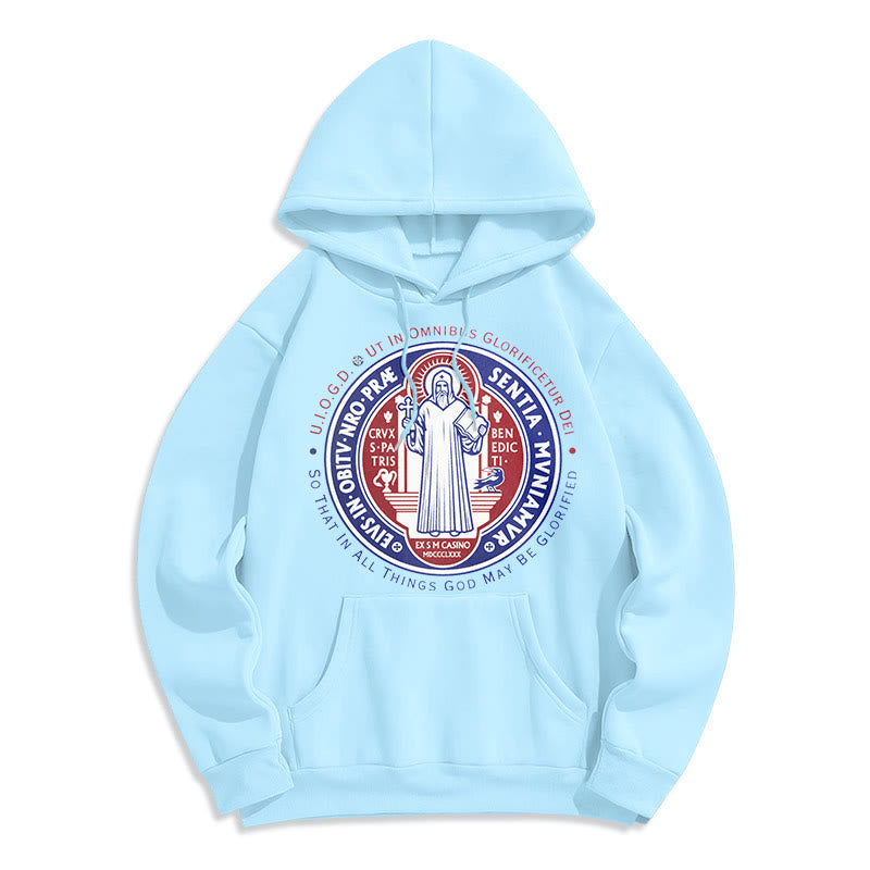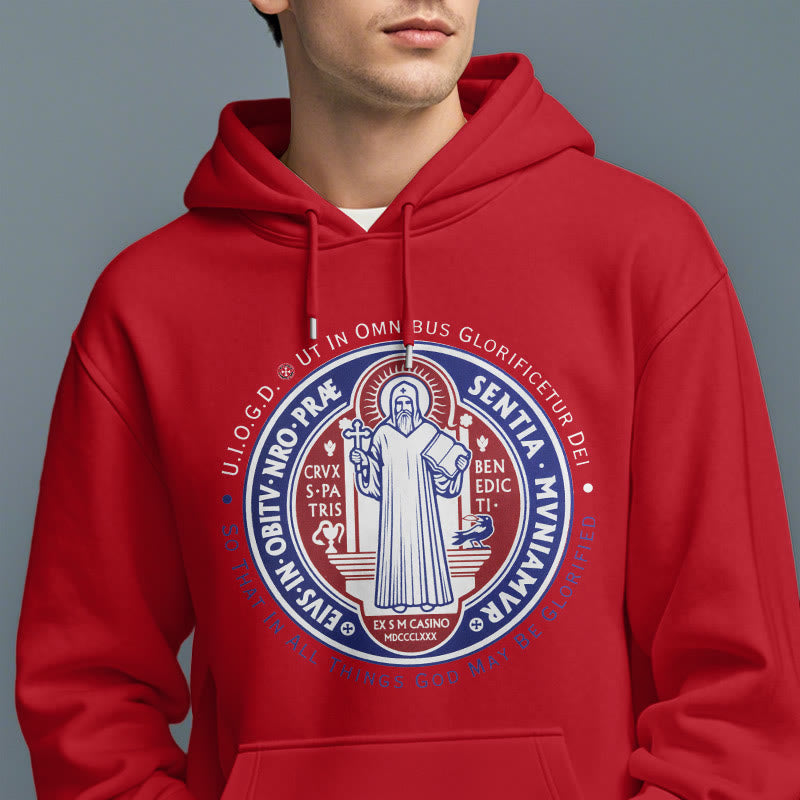 Dieser Hoodie besticht durch eine detailreiche Darstellung der Benedikt-Medaille, die für ihre schützende Wirkung auf die Gläubigen bekannt ist. Das kräftige und lebendige Design fängt die Essenz der Schutzkraft des Heiligen Benedikt ein und macht ihn zu einem eindrucksvollen und bedeutungsvollen Zeugnis Ihres Glaubens.