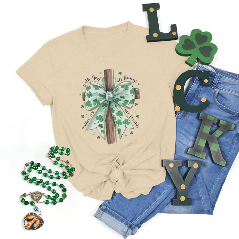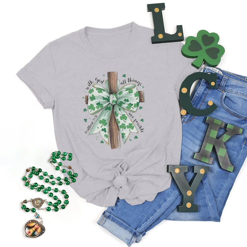 Feiern Sie die Magie des St. Patrick's Day mit unserem bezaubernden T-Shirt „Mit Gott ist alles möglich“. Dieses T-Shirt verbindet auf wundervolle Weise die Essenz des Feiertags mit einer tiefen Botschaft von Glauben und Hoffnung. Mit einem filigranen Kreuz, verziert mit einer Schleife im Kleeblatt-Muster, zollt es dem reichen Erbe des St. Patrick's Day Tribut – ein Symbol für Glück, Glauben und Segen. Der inspirierende Vers aus Matthäus 19:26 erinnert uns sanft daran, dass mit Gottes Gnade jede Möglichkeit erreichbar ist. Tragen Sie dieses Shirt als Zeichen göttlichen Segens und lassen Sie Ihren Tag mit dem wahren Geist des St. Patrick's Day erfüllen – Freude, Glauben und ein Hauch von Magie.