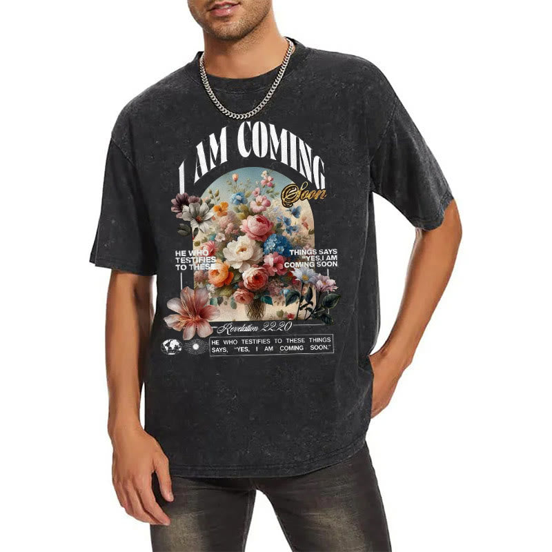 - Die floralen Motive, die den Text umgeben, symbolisieren die Schönheit und Erneuerung, die oft mit der Hoffnung auf die Wiederkunft Christi verbunden werden. Die dekorativen Elemente und die Wiederholung der Kernbotschaft unterstreichen die Vorfreude und Bedeutung dieses Ereignisses für Gläubige. Das Tragen dieses T-Shirts ist eine Möglichkeit, den Glauben an die Verheißung der Wiederkunft Jesu auszudrücken und diese hoffnungsvolle Botschaft mit anderen zu teilen.