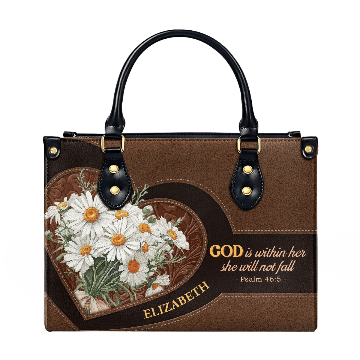 Psalm 46:5 inspirierte personalisierte Lederhandtasche mit Gänseblümchen- und Herzdesign