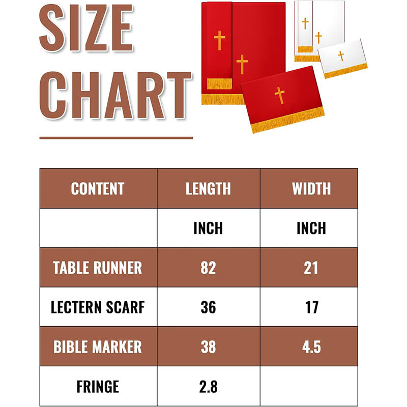 - Länge :Tischläufer: 82''*21''/208*53cmRednerpultschal: 36''*17''/91*43cmBibelmarker: 38''*4.5''/96*11cm