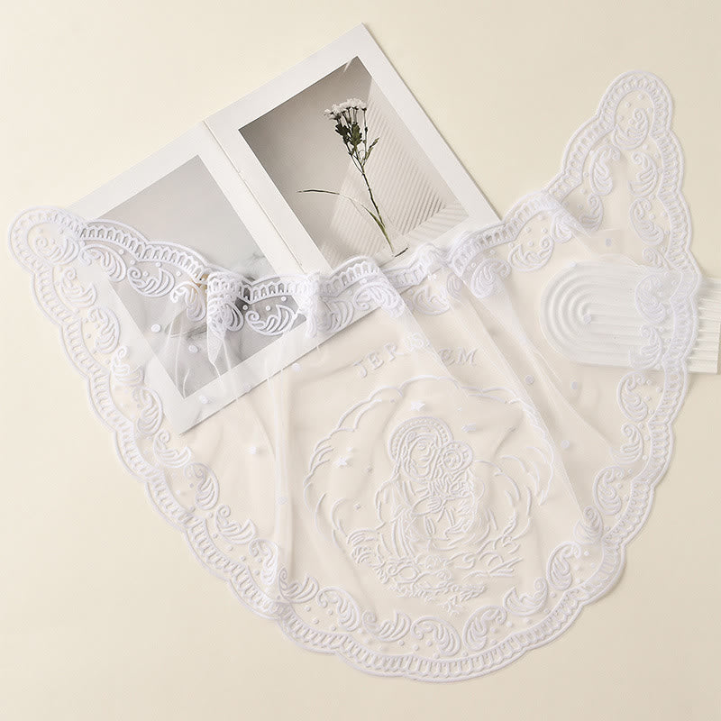 Dieser mit zarter Spitzenstickerei gefertigte Kapellenschleier ist für Momente des Gebets, der Messe und heiliger Feiern gedacht. Seine halbtransparente Textur vermittelt Demut vor Gott und verleiht gleichzeitig einen Hauch von Anmut und Hingabe. - Symbole des Glaubens und des Schutzes