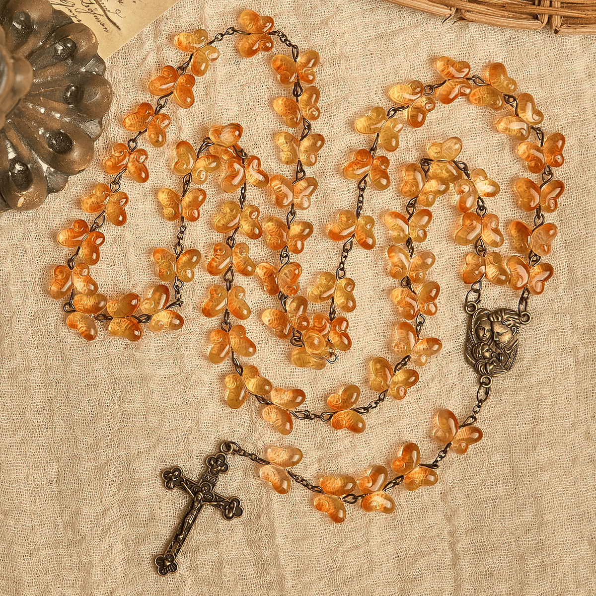 Dieser Rosenkranz verbindet Retro-Ästhetik mit tiefer spiritueller Bedeutung. Das antike Bronzekruzifix und die Medaille der Heiligen Familie erinnern an die Zeitlosigkeit des Glaubens und die ewige Liebe Christi, während die herbstlich gefärbten, schmetterlingsförmigen Perlen die Schönheit der Natur und den Vintage-Charme zelebrieren und das Gebet zu einer herzlichen Mischung aus Hingabe und nostalgischem Charme machen. - Herbst – Farbige Schmetterlingsperlen, antike Bronzeakzente und Vintage-Details