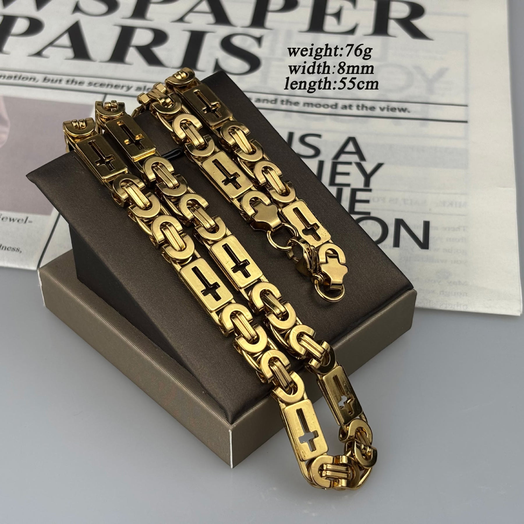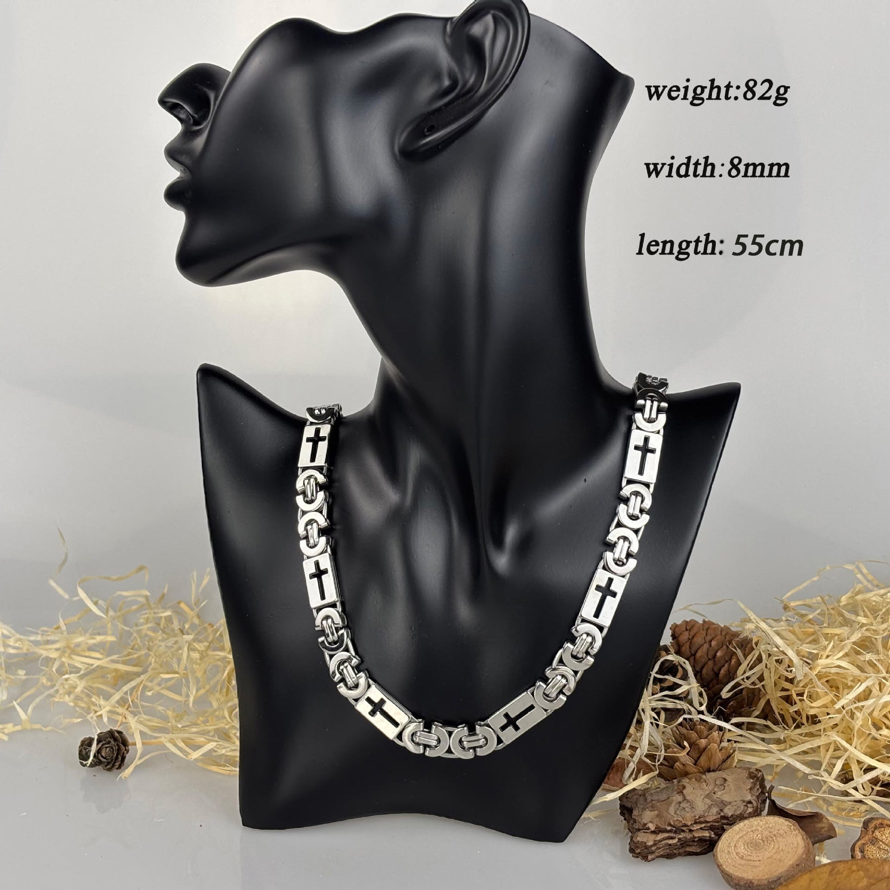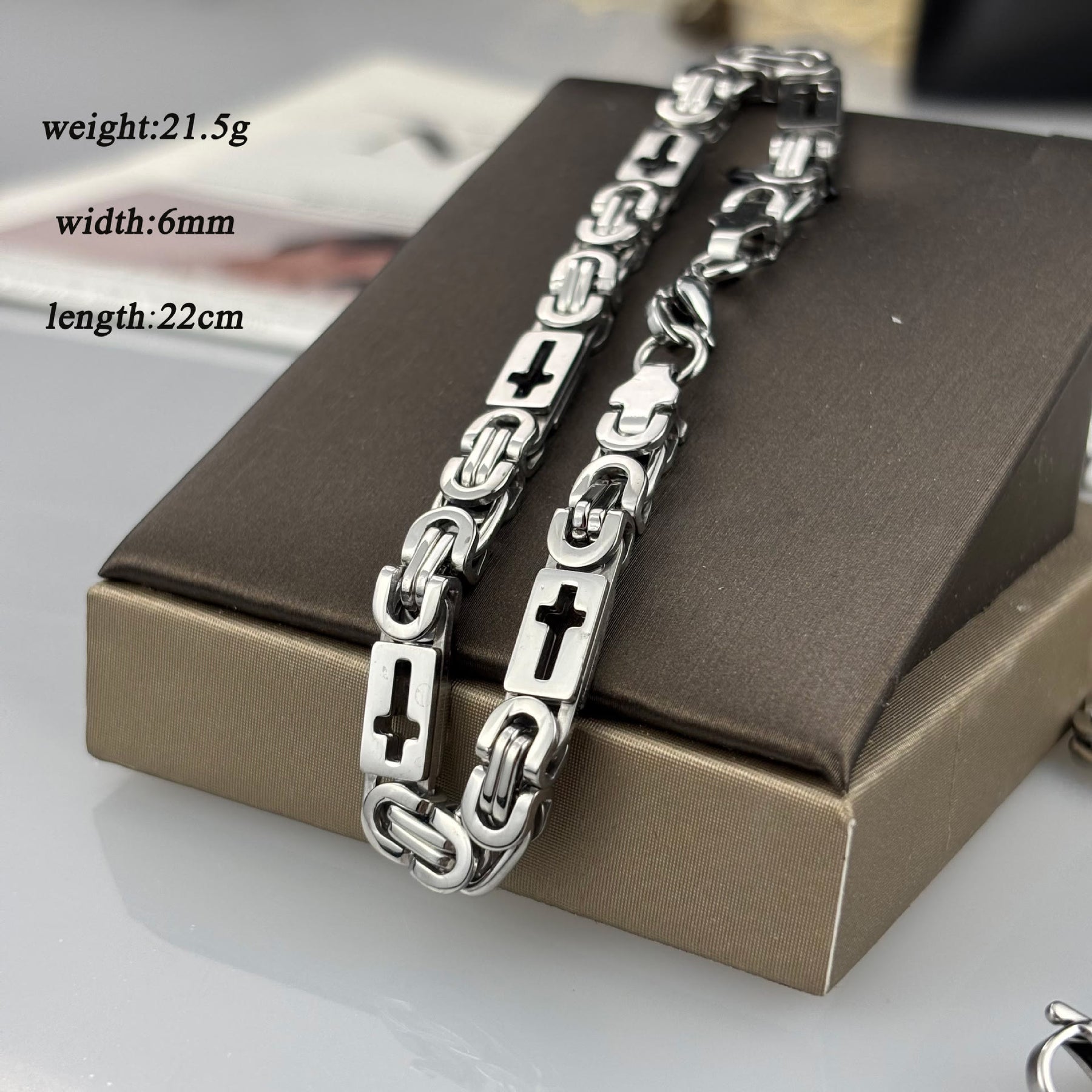 Die polierte zweifarbige Metalloberfläche verleiht der Kette ein klares, modernes Aussehen, während die wiederholten Kreuzdetails die uralte Geschichte von Glauben und Ausdauer erzählen.