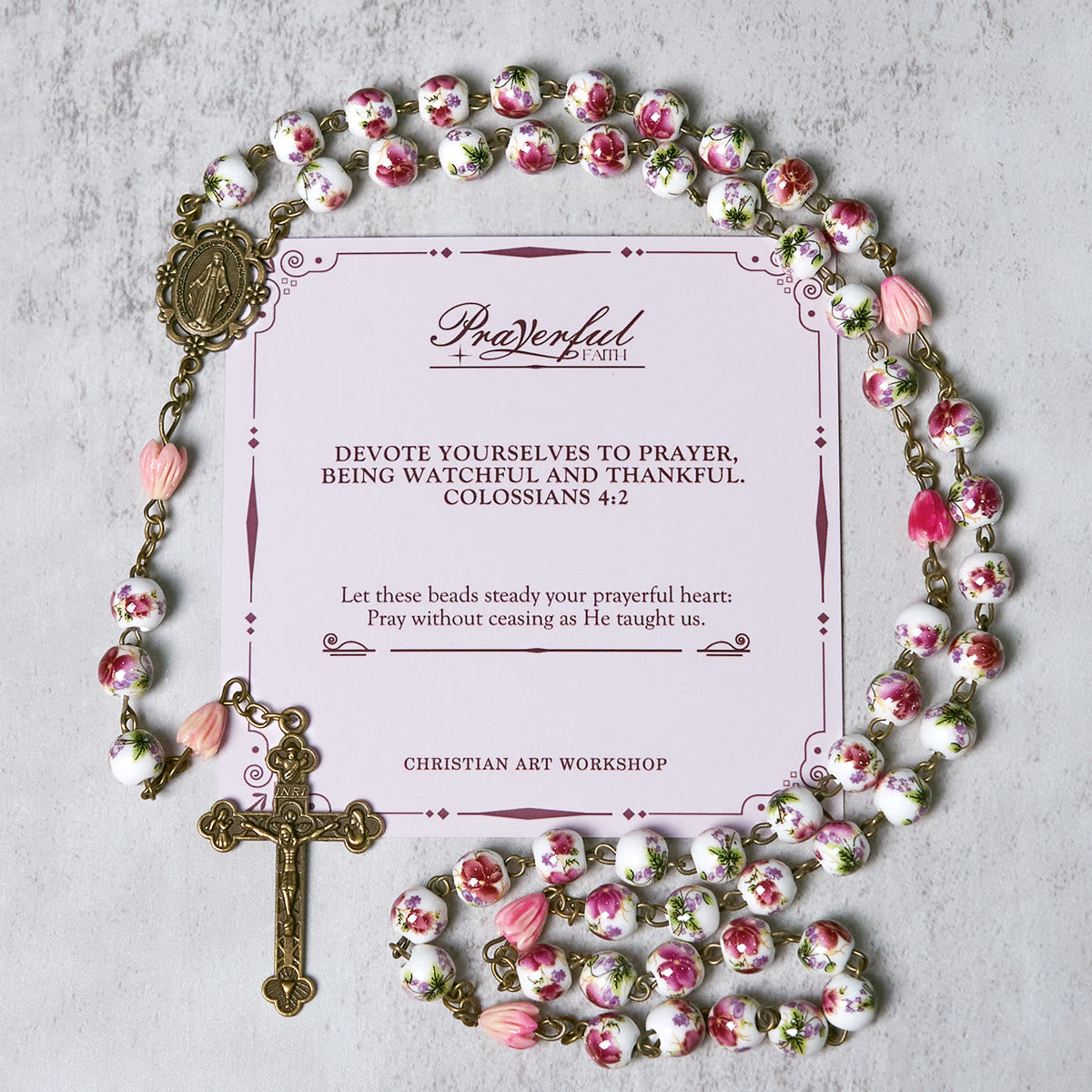 Der Rosenkranz besteht aus Keramikperlen, die jeweils mit einem kunstvollen Blumenmuster verziert sind. Ihre glatte Oberfläche bietet beim Beten ein angenehmes und angenehmes Gefühl. Das Keramikmaterial mit seiner raffinierten Eleganz verleiht Ihrem Gottesdienst einen zeitlosen Charme. - Zarte Akzente aus Harzblumen