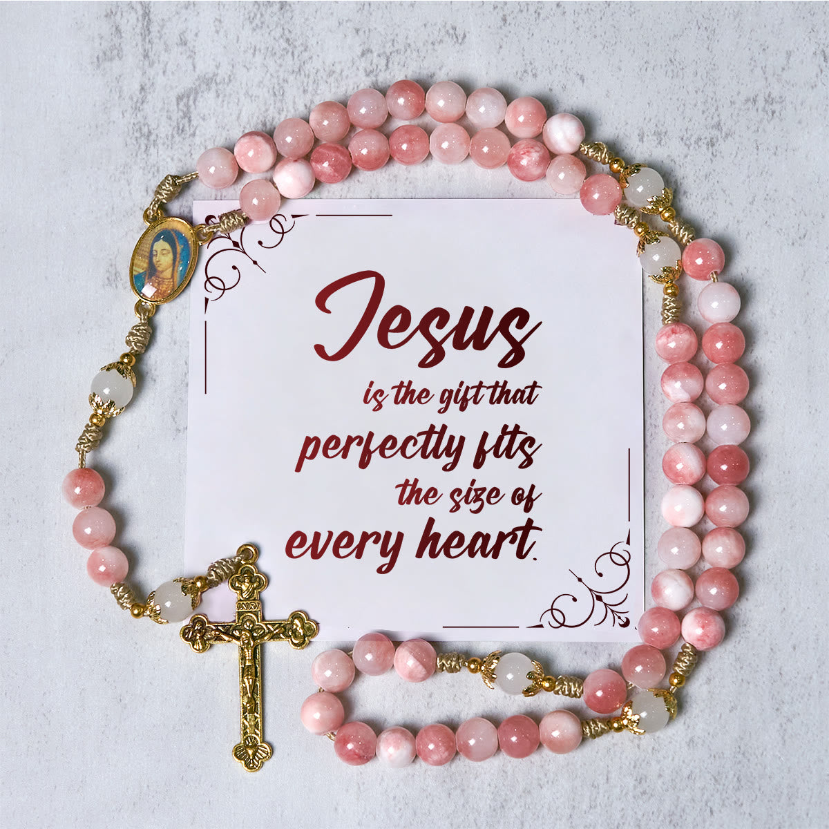 Zartrosa glänzende Perlen sind mit goldenen Akzenten verflochten, in der Mitte befindet sich ein Anhänger der Muttergottes für göttliche Anmut. - Handgefertigte Hingabe, elegante Note