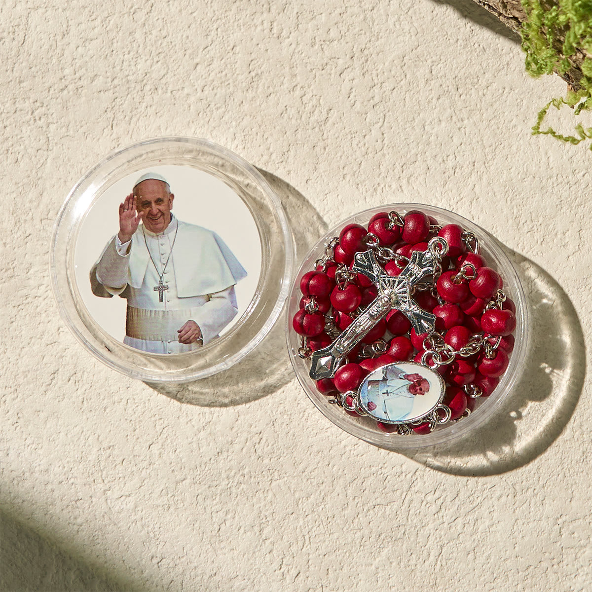 Göttlicher Rosenkranz aus Holz in Rot und Weiß mit Segenskasten von Papst Franziskus