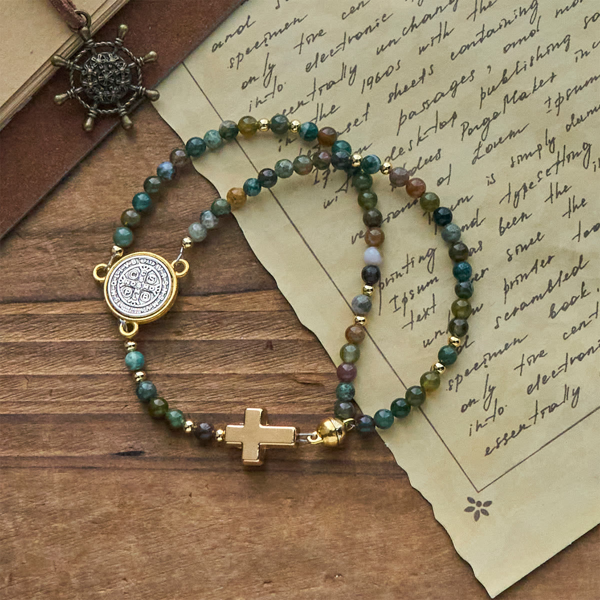 Die St.-Benedikt-Medaille, die im Mittelpunkt dieses Designs steht, ist ein jahrhundertealtes christliches Symbol, das vor dem Bösen, der Versuchung und dem Schaden schützen soll. - Vom Handgelenk zum Gebet – Zwei-in-Eins-Zweck