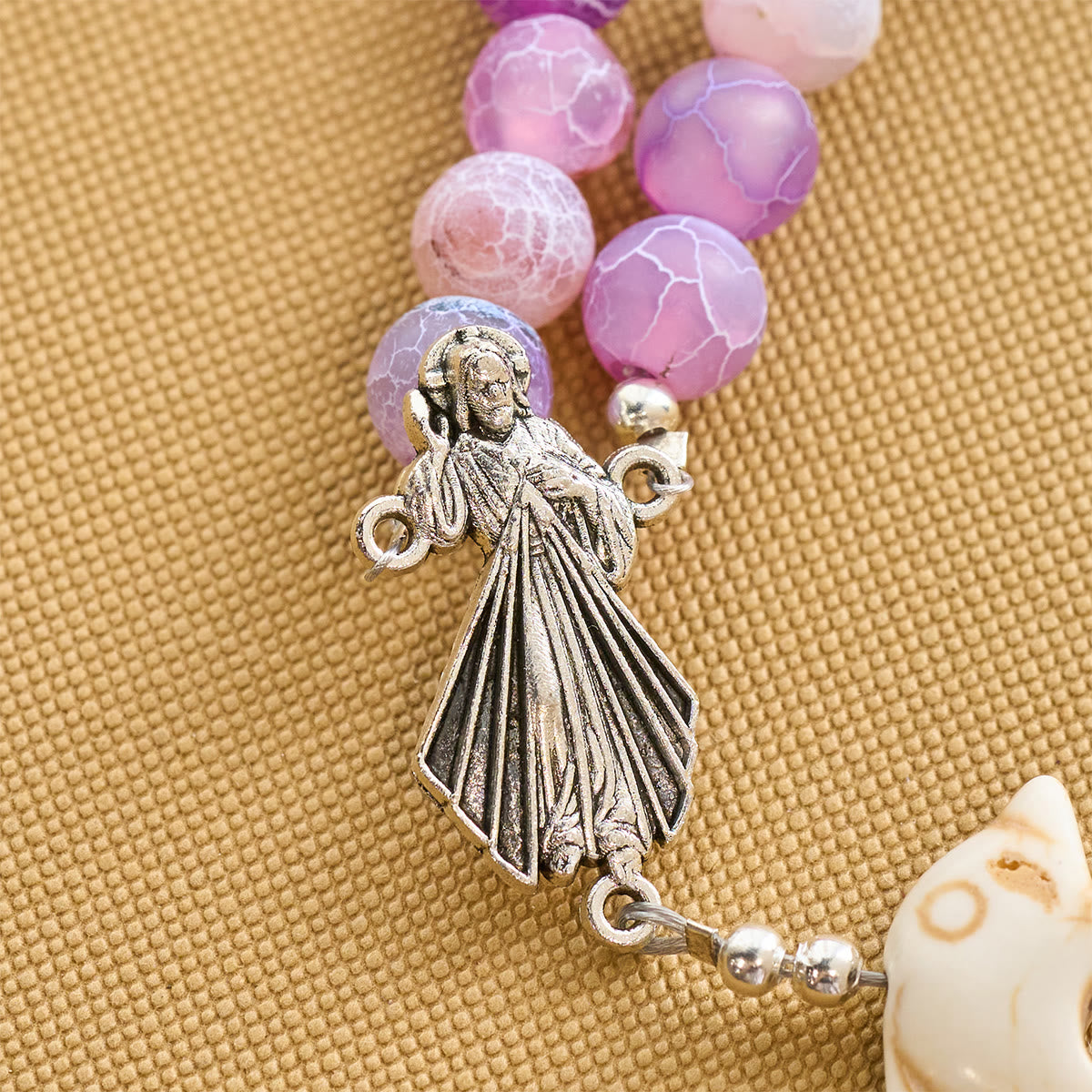 Dieser Rosenkranz vereint auf anmutige Weise das strahlende Bild der Barmherzigkeit Gottes mit einem Delfin-Akzent und violetten, verwitterten Achatperlen und ist eine eindringliche Erinnerung daran, dass Gottes Liebe sich auf die gesamte Schöpfung erstreckt – auf jede Seele, jedes Geschöpf, jedes Leben in seiner Obhut. - Göttliche Barmherzigkeit – Eine endlose Umarmung der Liebe