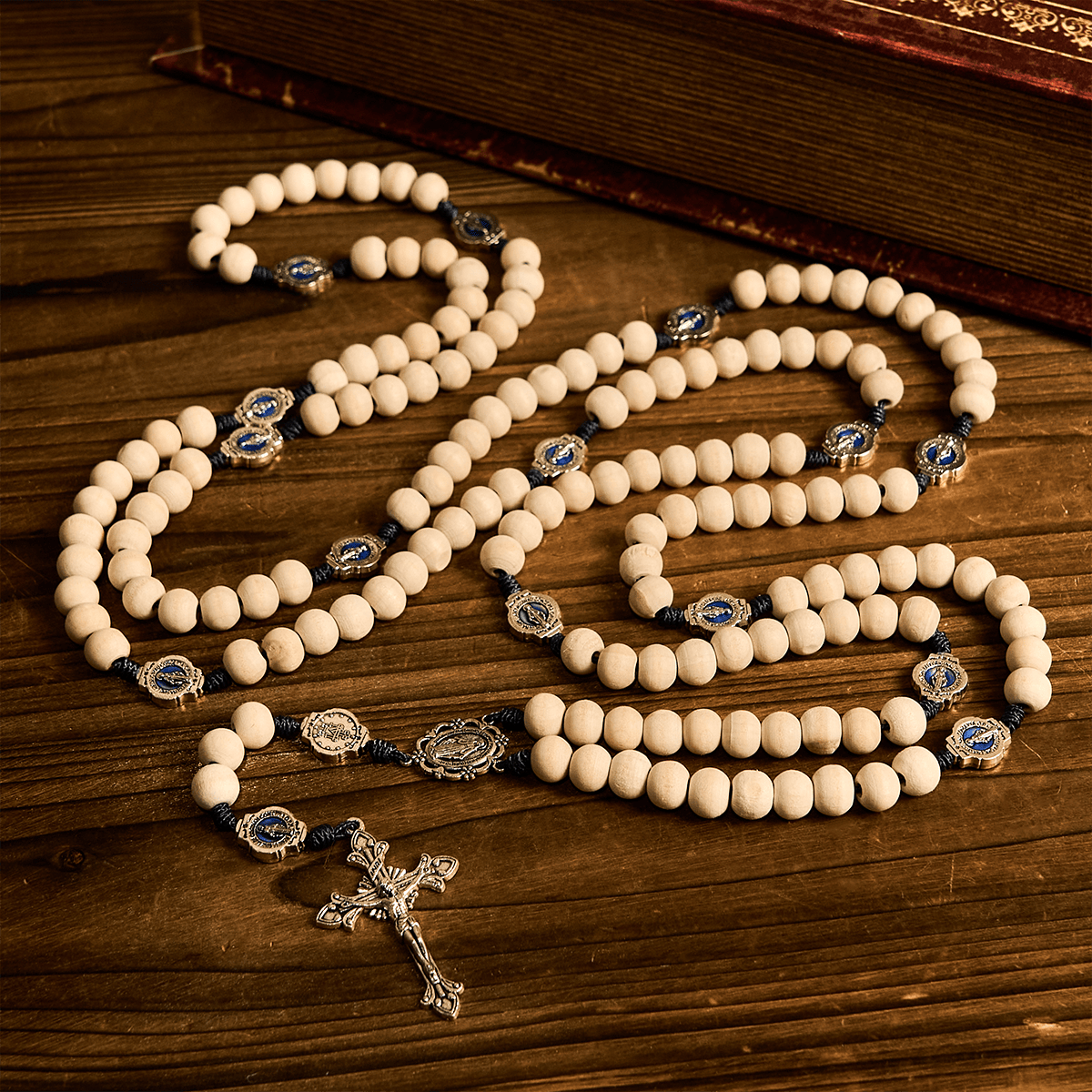 Der Rosenkranz aus glatten elfenbeinfarbenen Perlen strahlt Reinheit, Demut und zeitlose Eleganz aus. Die eingearbeiteten blauen Wundertätigen-Medaillen symbolisieren die Gegenwart der Heiligen Jungfrau Maria. - Wundertätige Medaille und Kruzifix der Erlösung