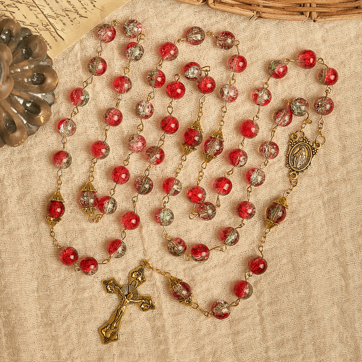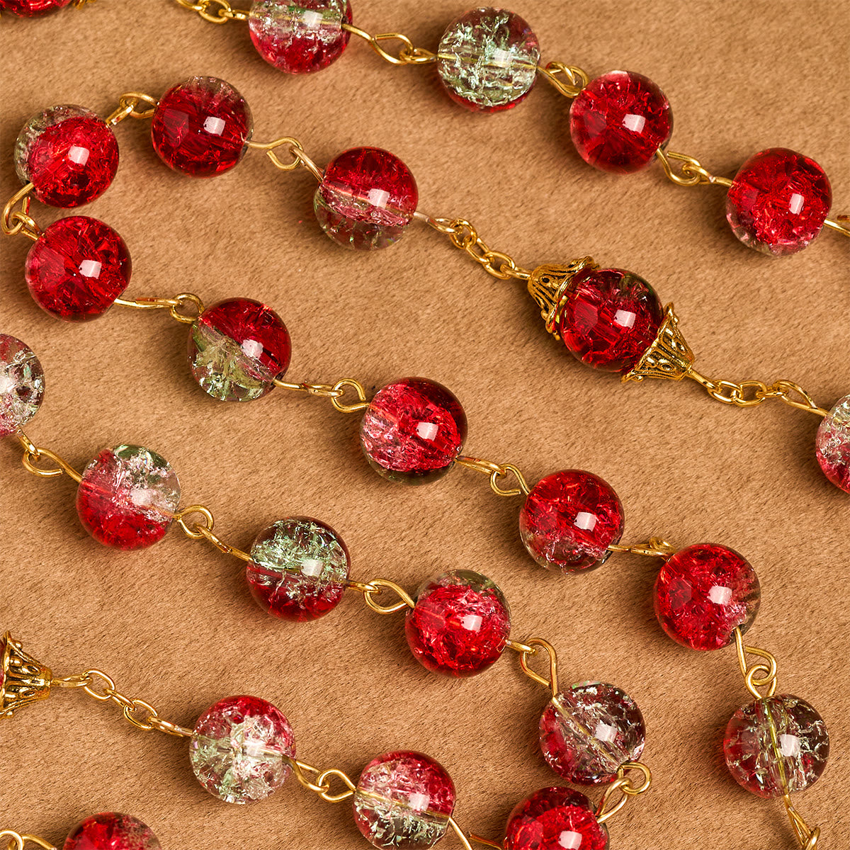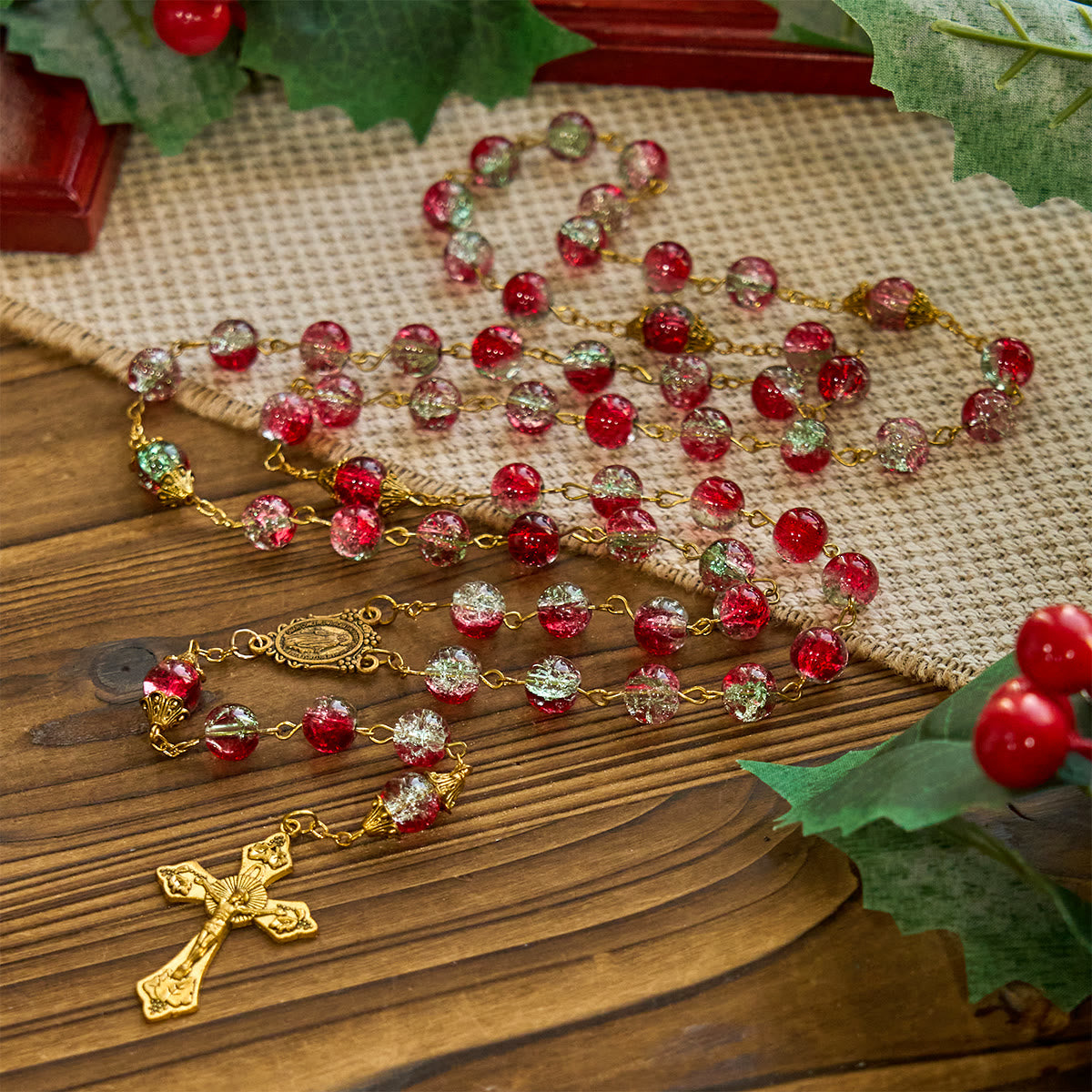 Dieser Rosenkranz verbindet festliche Weihnachtsinspiration mit tiefer spiritueller Bedeutung. Das goldene Kruzifix erinnert an die Liebe und das Opfer Christi, während die rot-grünen Perlen (in klassischen Weihnachtsfarben) die Freude der Weihnachtszeit feiern und das Gebet zu einer herzlichen Mischung aus Hingabe und festlichem Charme machen. - Rote und grüne Perlen, goldene Akzente und Vintage-Weihnachtsdetails