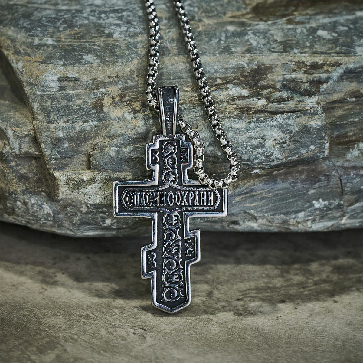 Diese orthodoxe Kruzifix-Halskette aus widerstandsfähigem Titanstahl ist rost- und lichtbeständig und hält so lange wie die Hingabe, die sie repräsentiert.