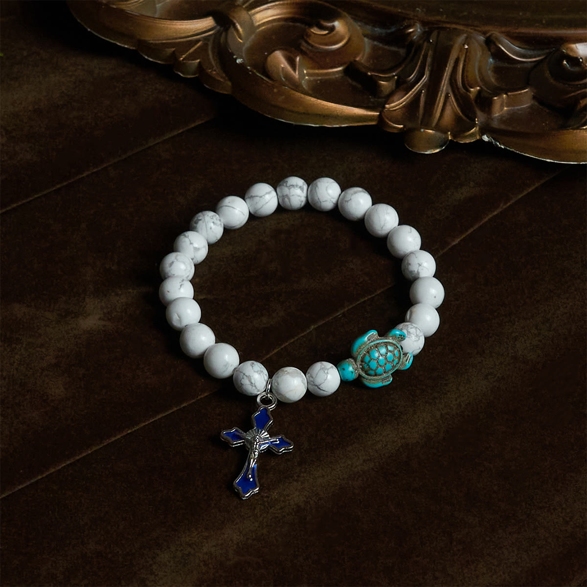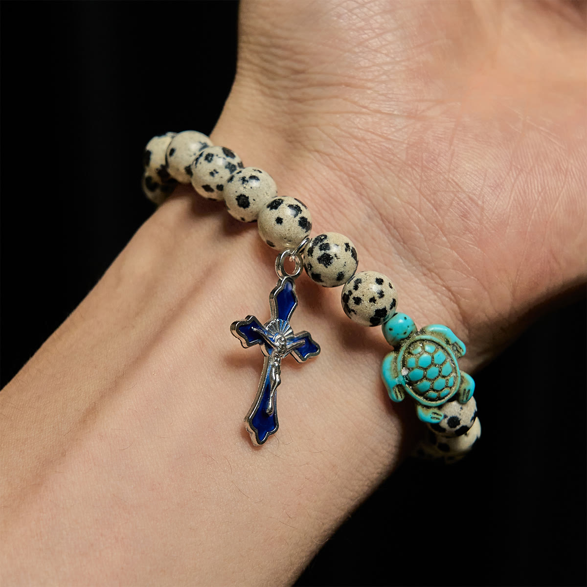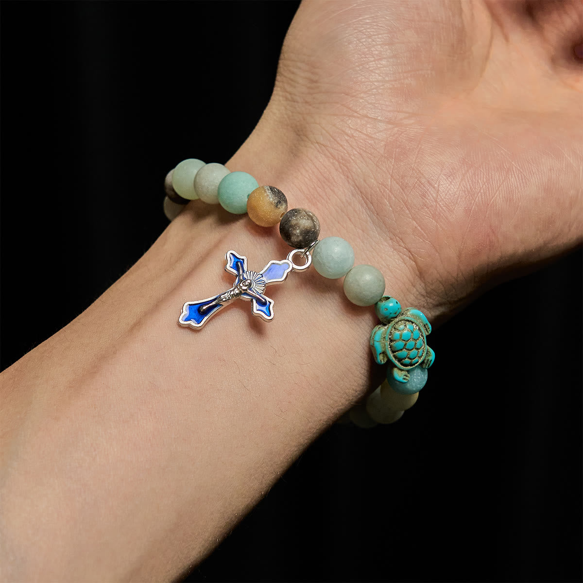 Tragen Sie Ihren Glauben mit Anmut durch dieses einzigartige Armband, bei dem Natursteinperlen auf das heilige Kreuz und die sanfte Form der Schildkröte treffen – und so Hingabe mit der Schönheit der Schöpfung vereinen. - Das Kreuz – Zeichen der Erlösung und Hoffnung