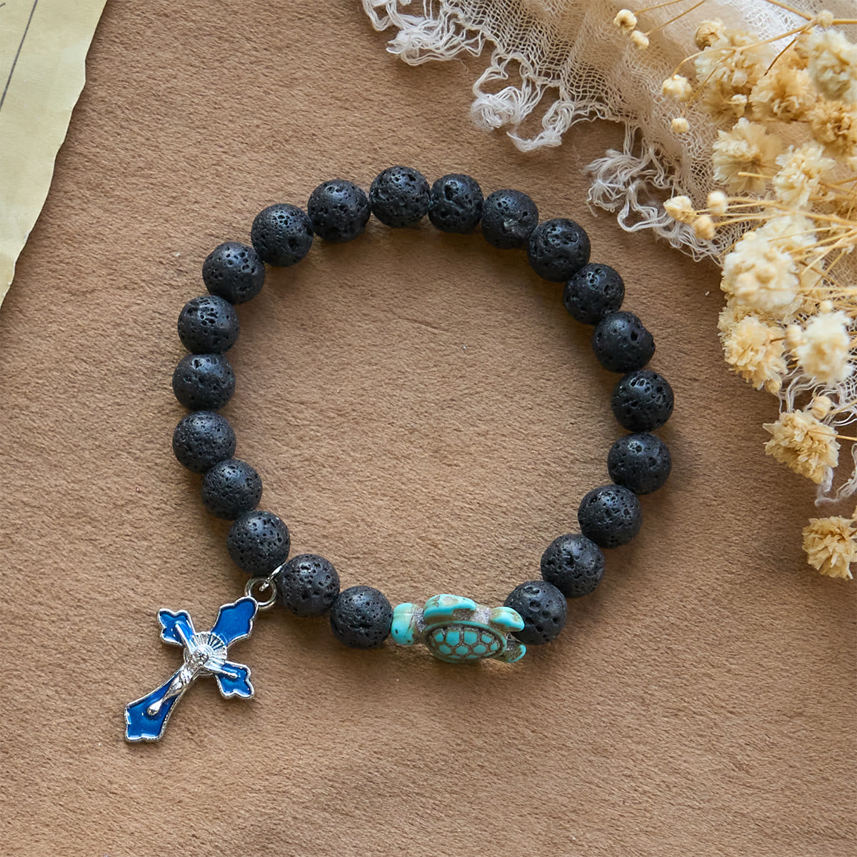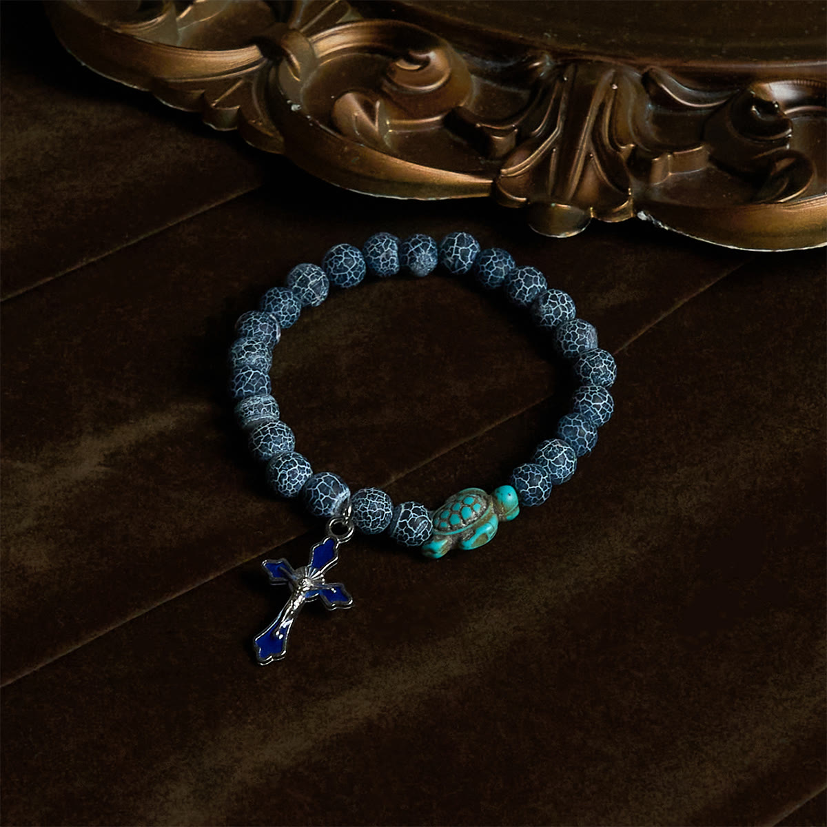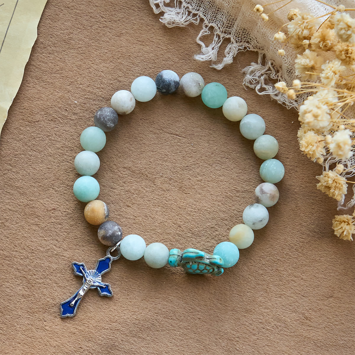 Tragen Sie Ihren Glauben mit Anmut durch dieses einzigartige Armband, bei dem Natursteinperlen auf das heilige Kreuz und die sanfte Form der Schildkröte treffen – und so Hingabe mit der Schönheit der Schöpfung vereinen. - Das Kreuz – Zeichen der Erlösung und Hoffnung
