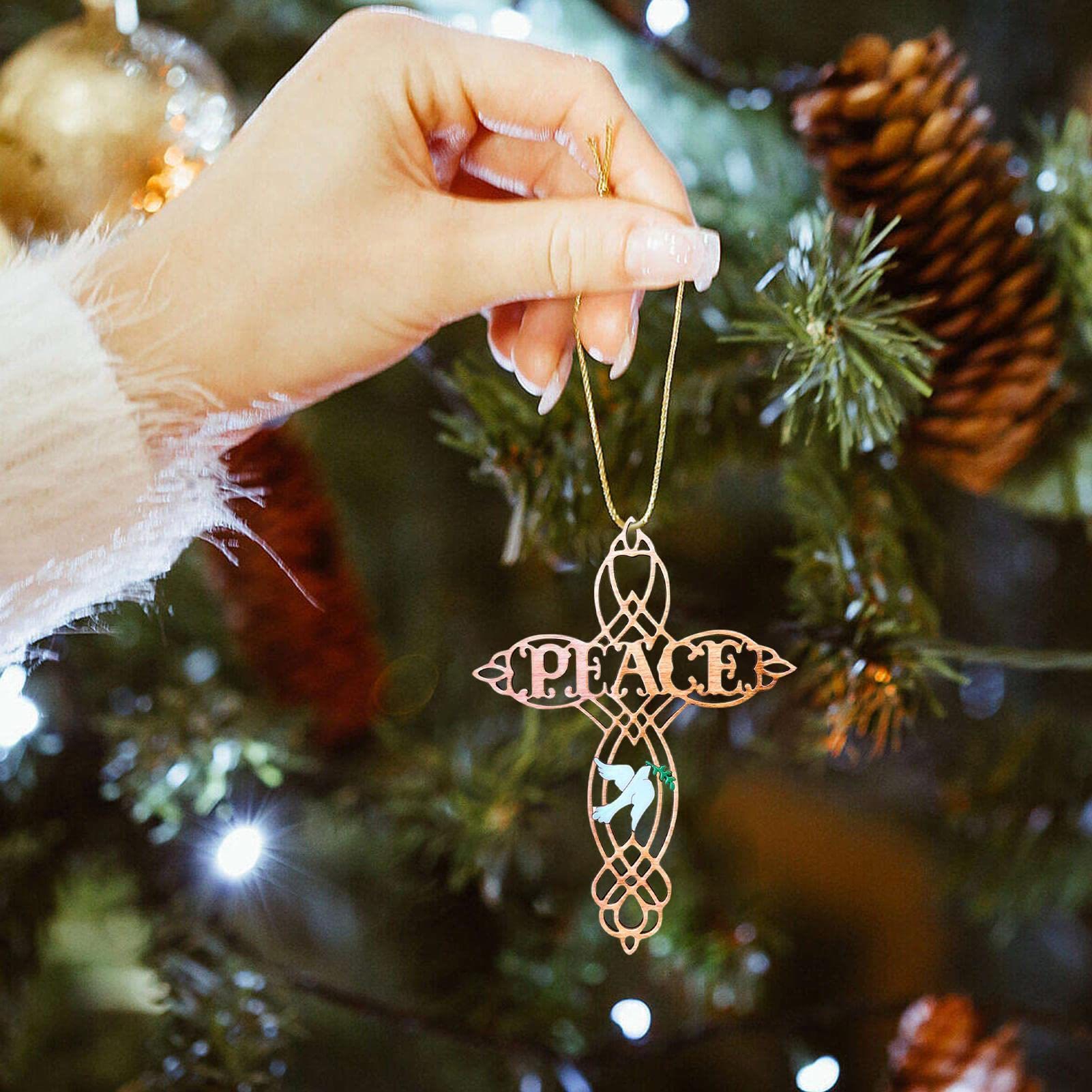 Unser Friedenskreuz-Ornament fängt die Essenz der Ruhe und göttlichen Gelassenheit während der Weihnachtszeit wunderschön ein. Dieses fein gearbeitete Stück ist nicht nur eine bezaubernde Dekoration, sondern auch eine tiefe Erinnerung an den Frieden, den Jesus Christus der Welt bringt. Mit dem Wort „FRIEDEN“, das elegant über das Kreuz graviert ist, und einer zarten weißen Taube, die einen Olivenzweig trägt, erinnert es an biblische Symbole und alte Versprechen von Frieden und Versöhnung. - Ein Testament für Gottes Versprechen
