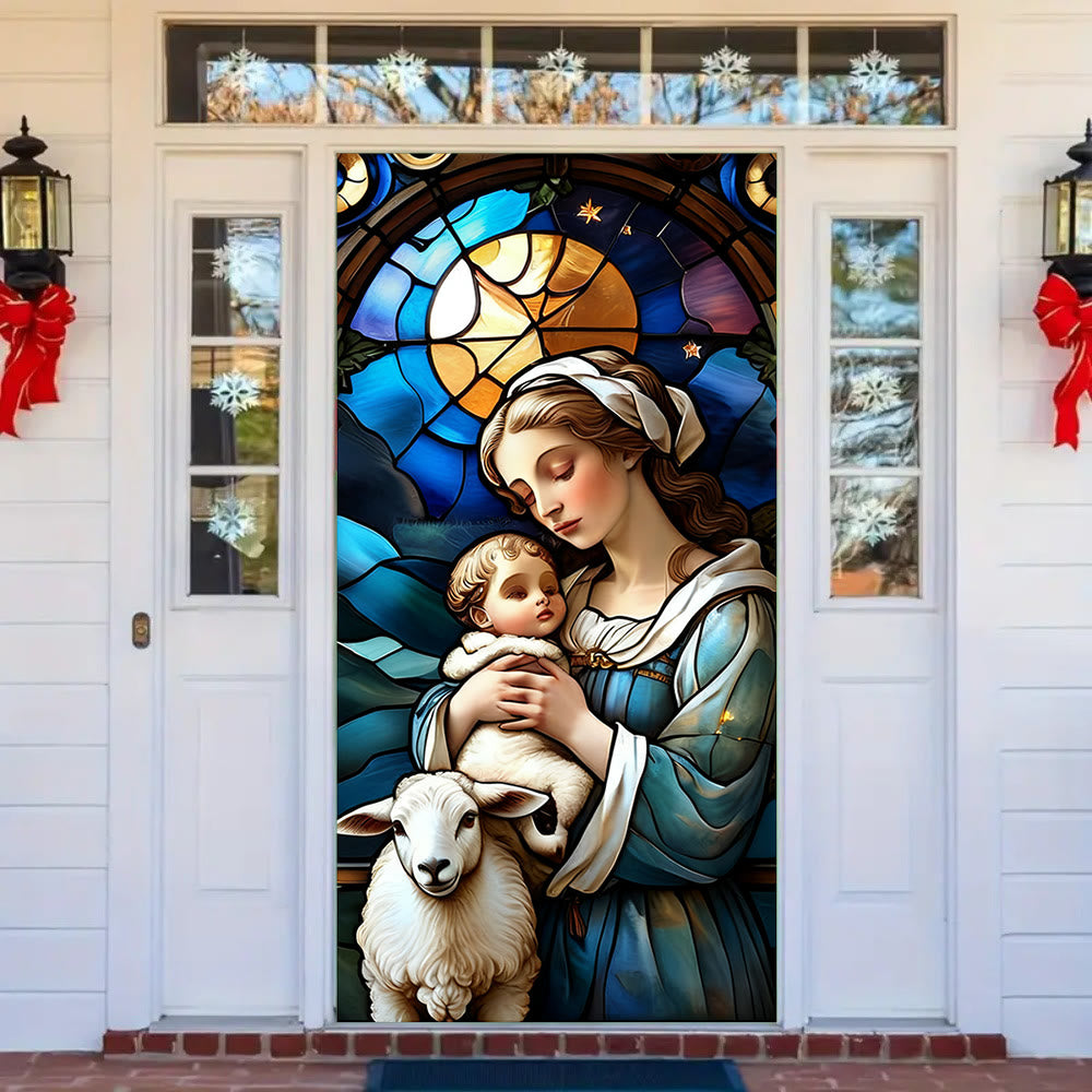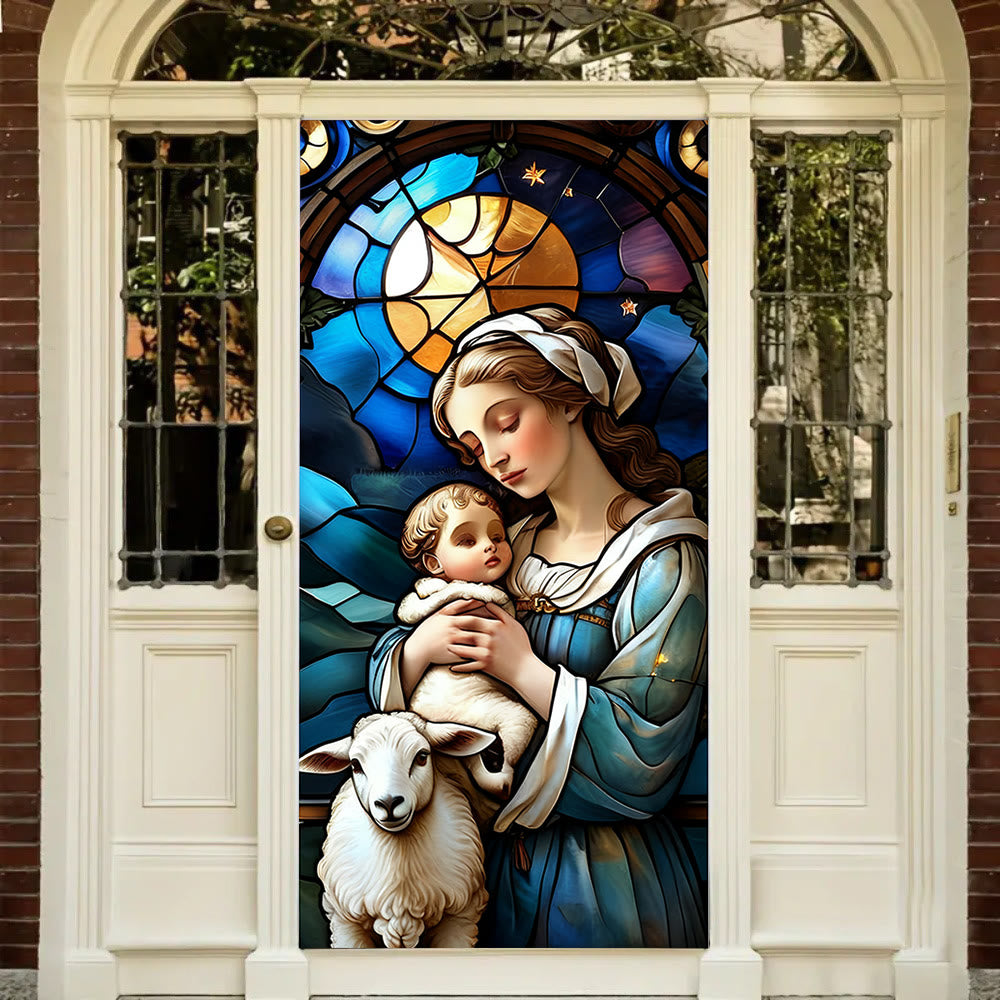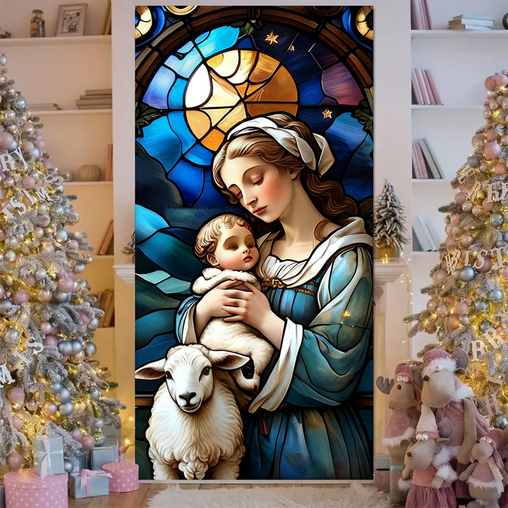 Dieser Türvorhang zeigt eine Szene im Stil eines Buntglasfensters mit der Jungfrau Maria, die das Jesuskind und ein Lamm hält, umgeben von farbenfrohen, detailreichen Mustern. Seine kunstvolle Verarbeitung verbindet festlichen Charme mit tiefgründiger Glaubenssymbolik. - Tiefe spirituelle Bedeutung