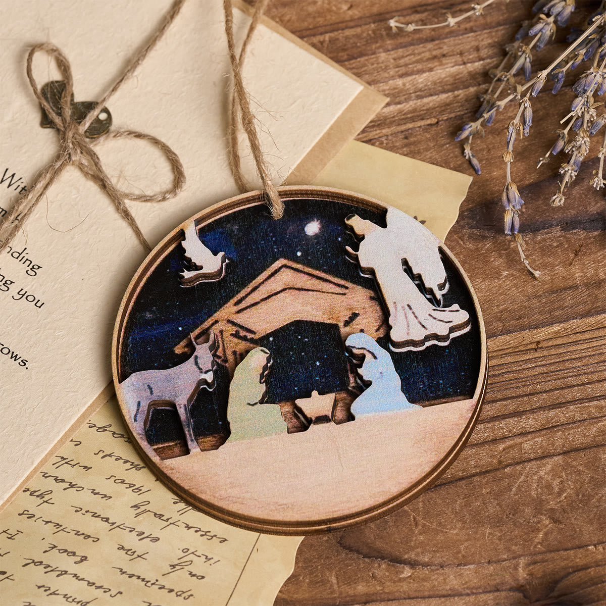 - 3D-Krippenszene aus Holz mit Engel- und Tieranhängern