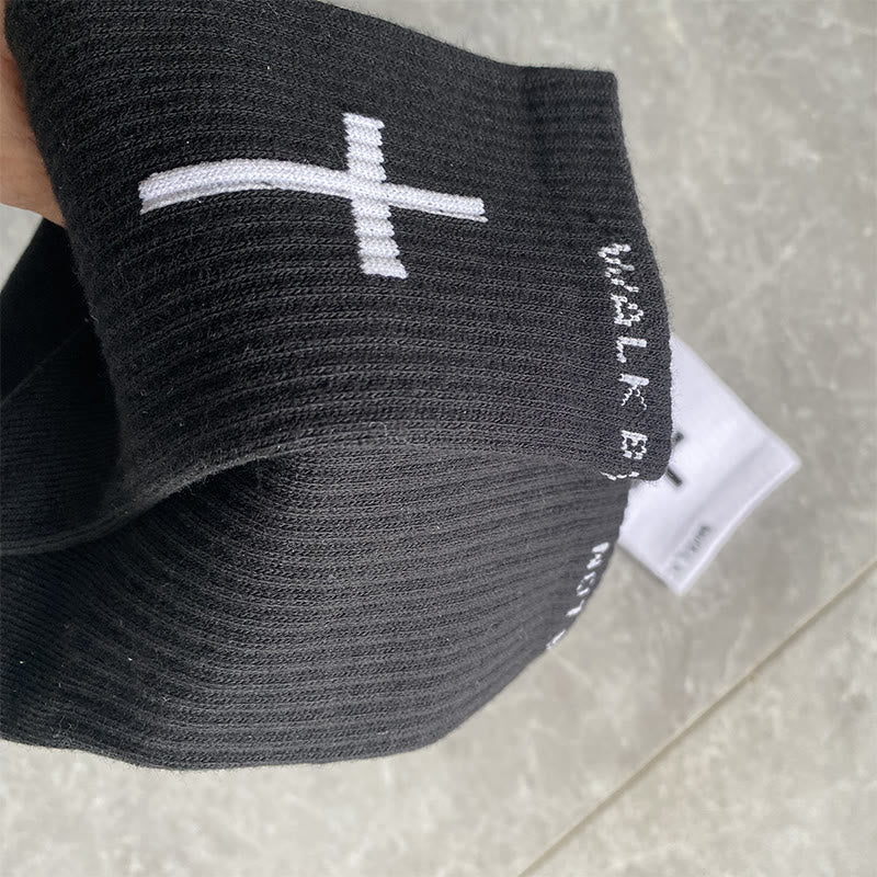 Diese christlichen Baumwollsocken sind ein subtiler und doch kraftvoller Ausdruck des Glaubens. Das markante Kreuzsymbol auf jeder Socke ist ein ikonisches Symbol des Christentums und steht für das Opfer und die Liebe Jesu Christi. Der elegant auf der Oberseite der Socken eingravierte Satz „WANDEL DURCH GLAUBEN, NICHT DURCH SEHEN“ ist ein tiefgründiges biblisches Prinzip. Er ermutigt Gläubige, auf Gottes Führung und Plan zu vertrauen, anstatt sich nur auf das zu verlassen, was sie in der physischen Welt sehen können, und dient als tägliche Erinnerung an spirituelle Wahrheit. - Komfort trifft göttliche Inspiration