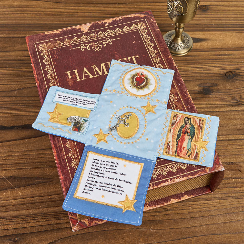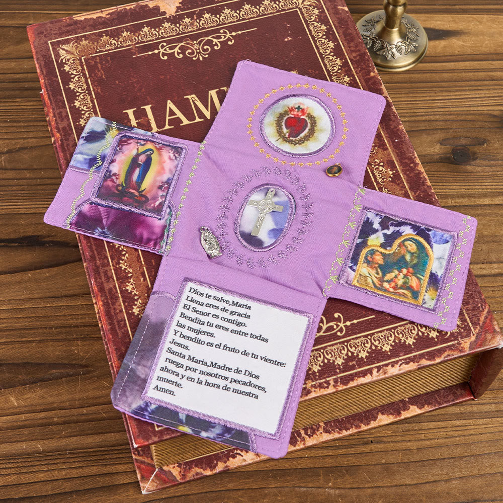 Mit größter Sorgfalt und Ehrfurcht gefertigt, besteht dieses Andachtsobjekt aus hochwertigen Materialien, die Langlebigkeit garantieren. Die präzise Verarbeitung sorgt dafür, dass die verschiedenen Elemente – von den ausdrucksstarken Bildern bis hin zu den heiligen Texten – sicher zusammengehalten werden. Jede Medaille, jedes Stoffstück und jede Gebetszeile wurde sorgfältig ausgewählt und platziert, um ein harmonisches Ganzes zu schaffen, das die Tiefe des Glaubens zum Ausdruck bringt. - Tragbarer Zufluchtsort, der spirituelle Wege nährt