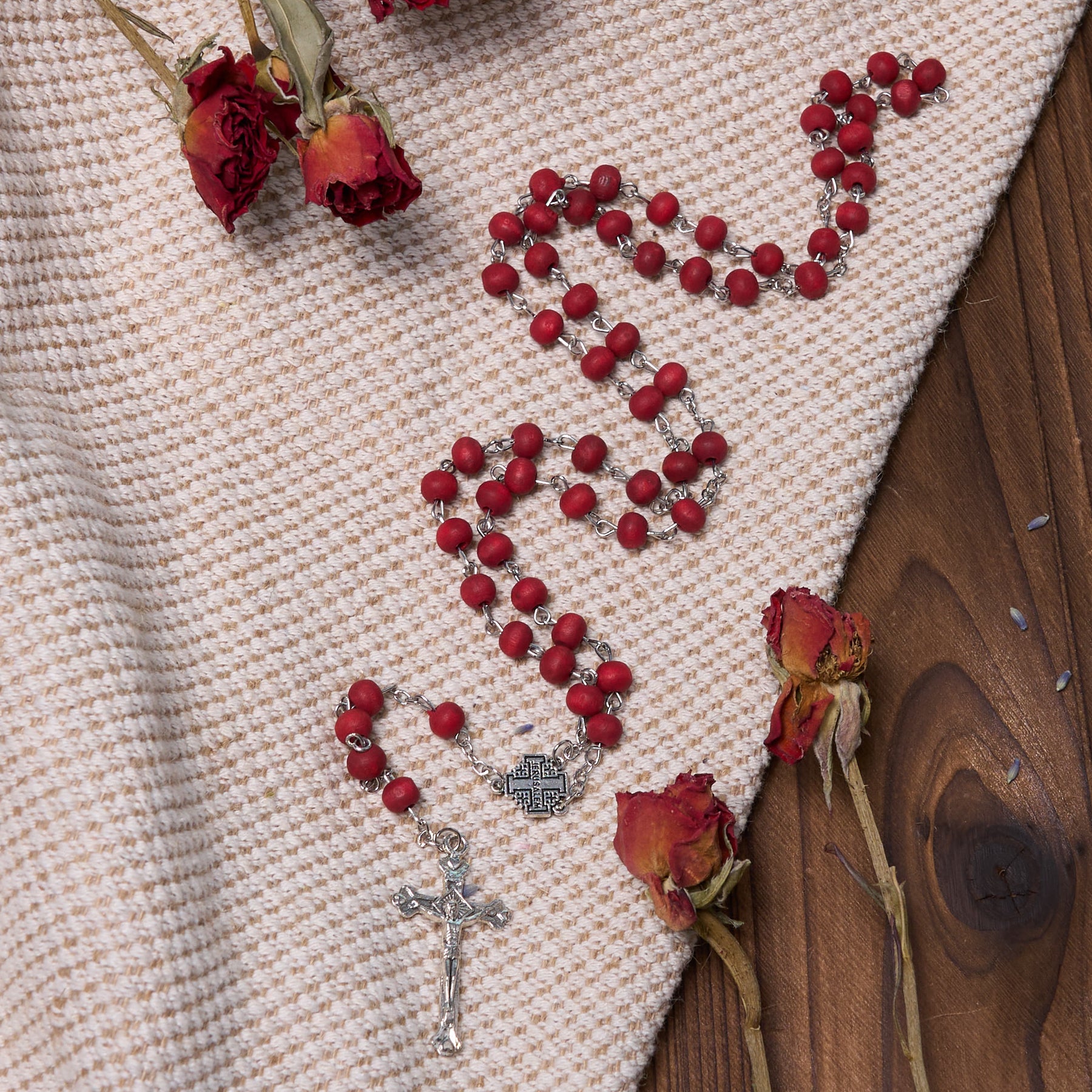 Erleben Sie mit jedem Gebet den beruhigenden und aromatischen Duft von Rosenholz. Die Perlen dieses Rosenkranzes sind sorgfältig aus natürlichem Rosenholz gefertigt, das für seinen herrlichen Duft und seine spirituelle Symbolik bekannt ist. Der sanfte, erdige Duft von Rosenholz bereichert Ihre Meditationspraxis, hilft Ihnen, Ihren Geist zu fokussieren und Ihre Gebete auf eine heitere, göttliche Ebene zu heben. - Detailliertes Kruzifix und Jerusalemkreuz: Symbole des Glaubens