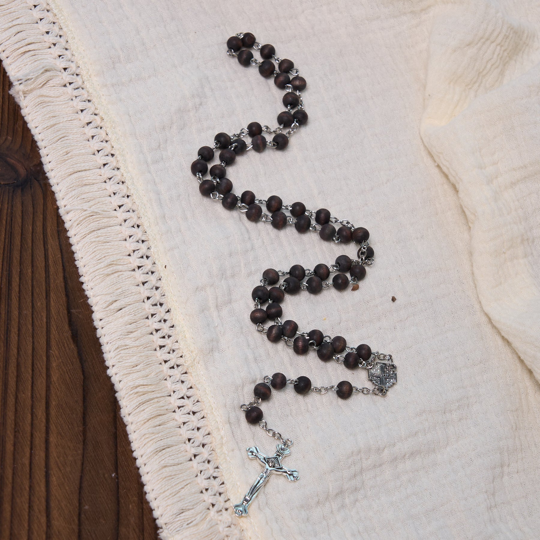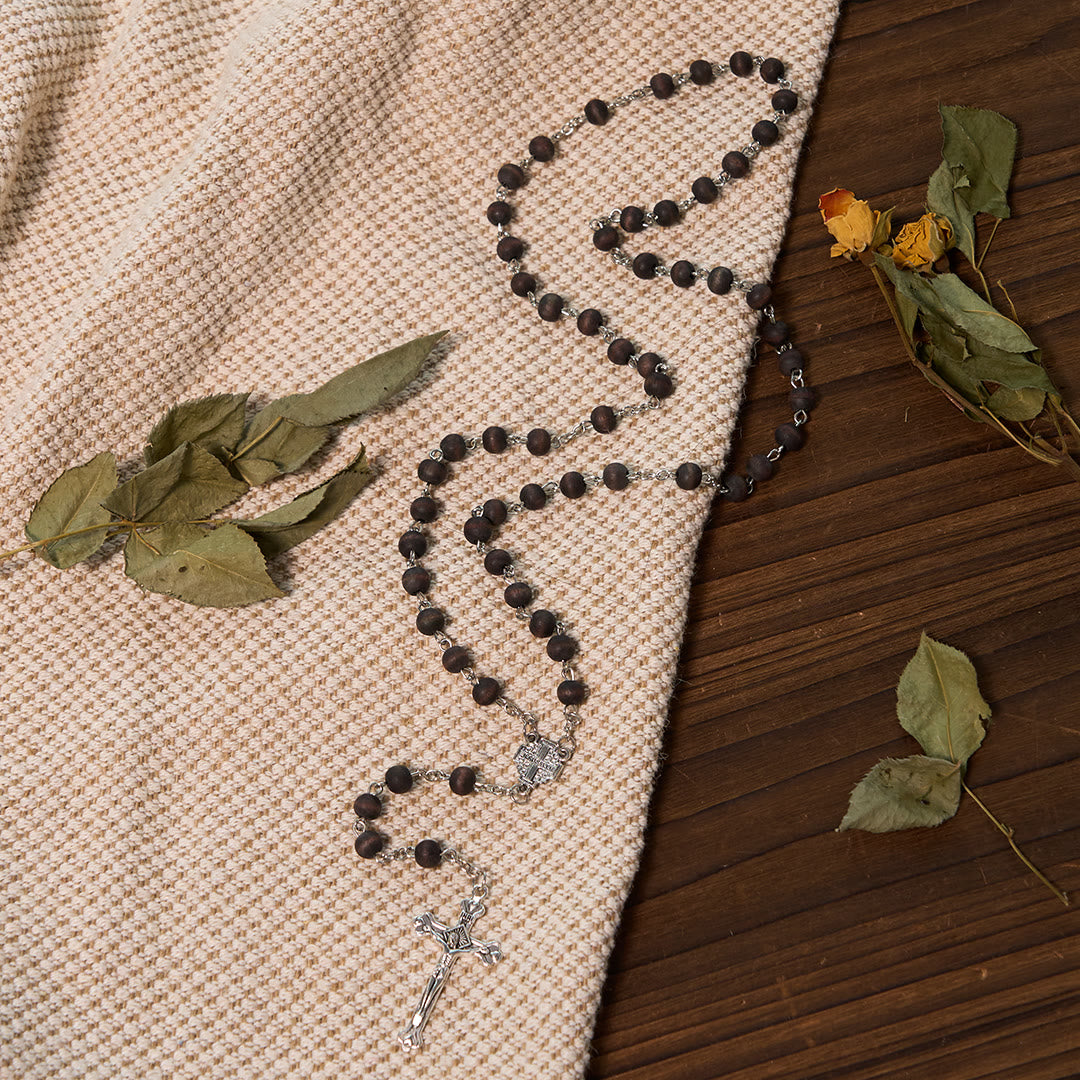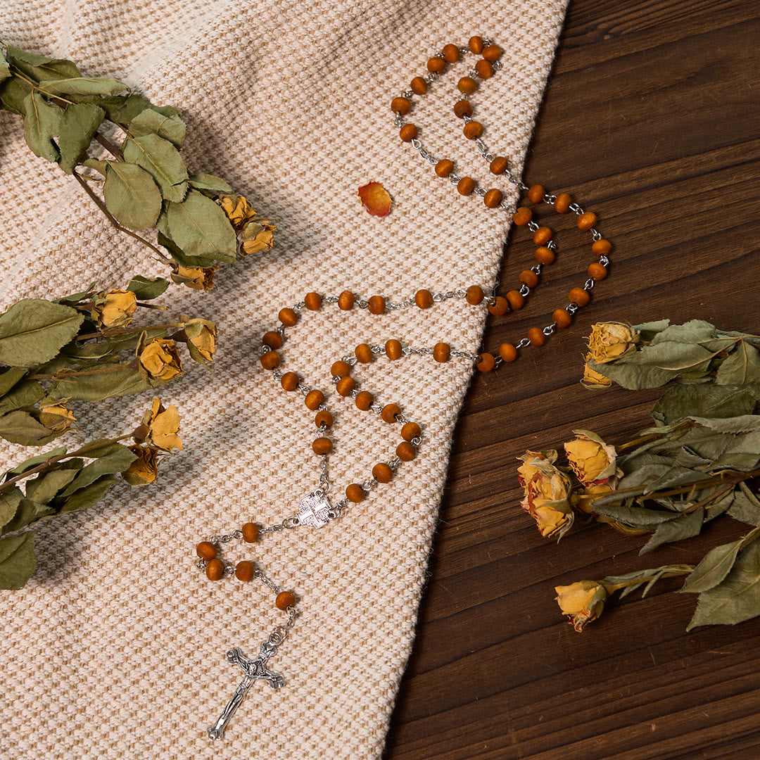Die Rosenholzperlen sind auf einer robusten Kette aus Legierung aufgereiht, die sowohl Stärke als auch Eleganz gewährleistet. Die robuste Konstruktion garantiert, dass dieser Rosenkranz ein fester Bestandteil Ihrer Andachtspraxis bleibt, während die glatte Oberfläche der Kette das taktile Erlebnis des Gebets verstärkt. - Bereichern Sie Ihr Gebetsleben