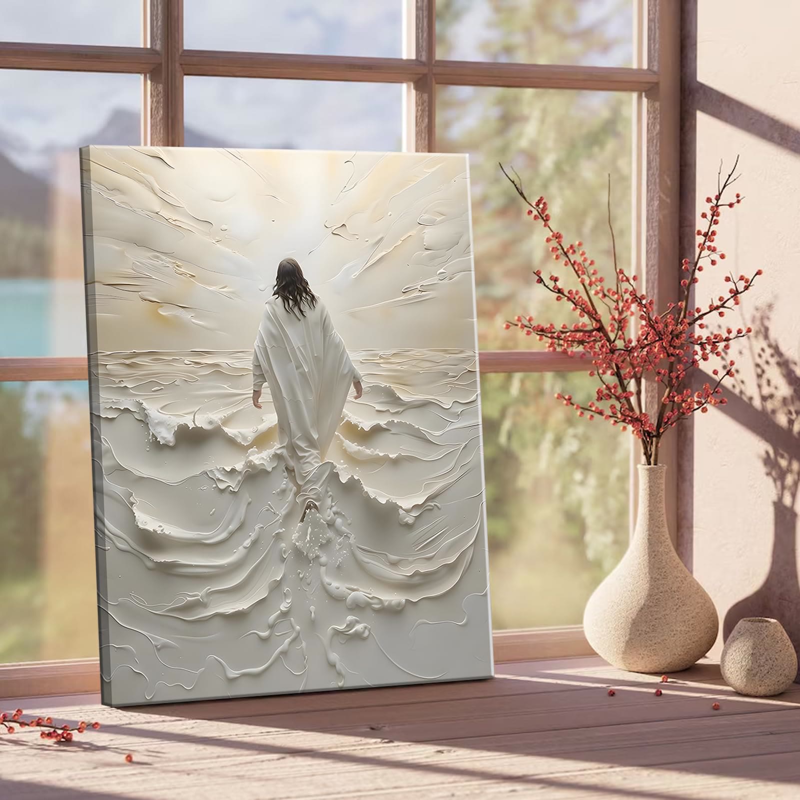 Dieser Kunstdruck, der Jesus auf dem Wasser wandeln zeigt und mit strukturierten, ätherischen Details versehen ist, strahlt spirituellen Glauben und göttliche Führung aus und lädt zur Reflexion über die wundersame Gegenwart Christi ein. - Erstklassige Handwerkskunst, bleibende Ehrfurcht