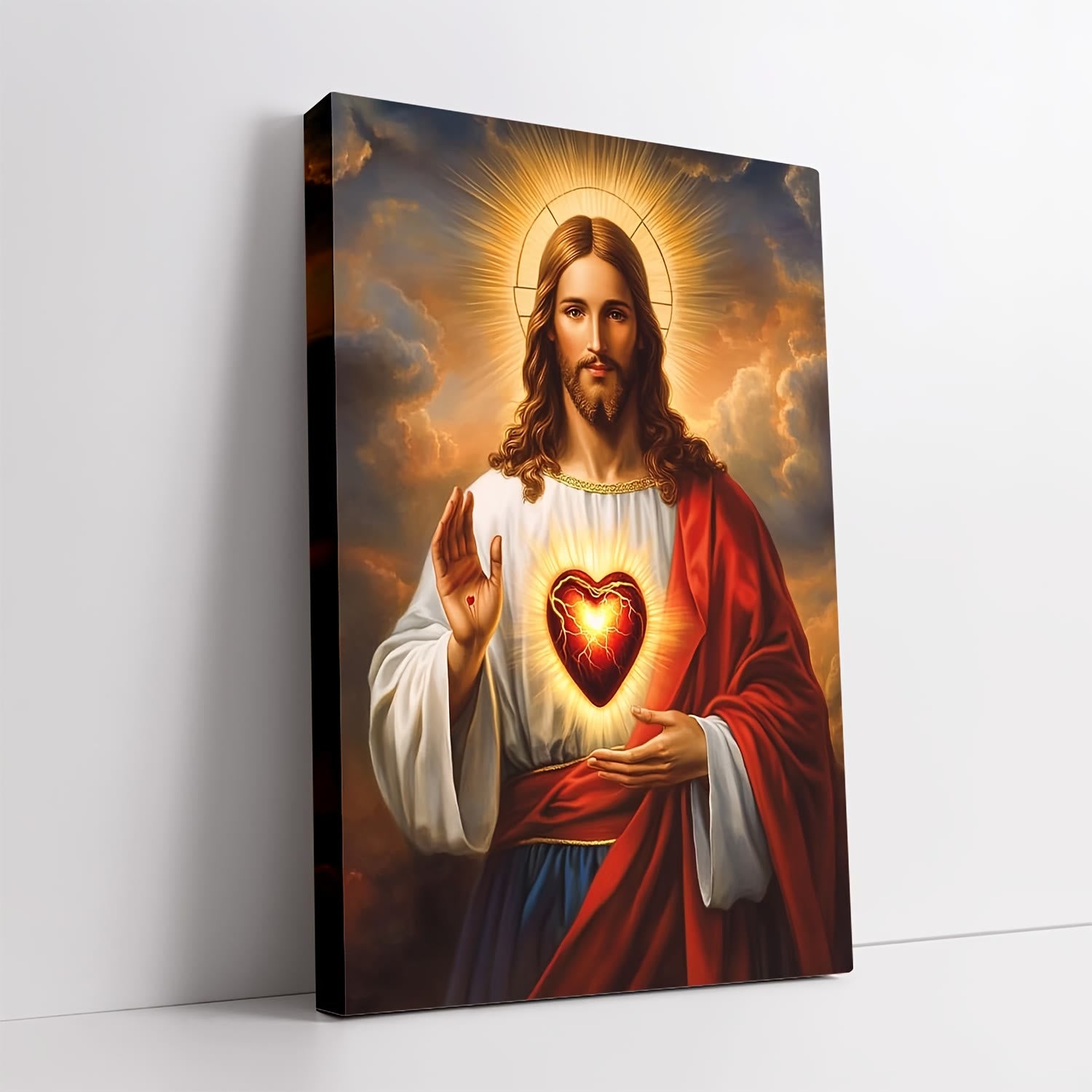 Dieses Kunstwerk zeigt das Heilige Herz Jesu mit einem strahlenden Heiligenschein und einer liebevollen Geste und strahlt göttliche Liebe und spirituelle Hingabe aus – es lädt zur Besinnung auf Christi grenzenloses Mitgefühl ein. - Hochwertige Leinwandverarbeitung, dauerhafte Heiligkeit
