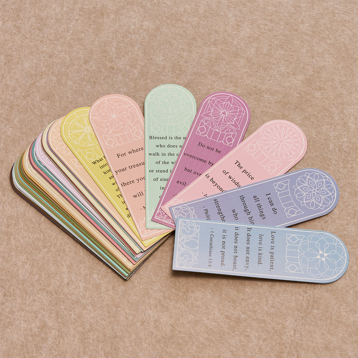 Eine Sammlung von dreißig Versen aus der Heiligen Schrift – über Liebe, Barmherzigkeit, Mut, Hoffnung und Vertrauen – in Form von Buntglasfenstern. Wechseln Sie jeden Tag einen aus, legen Sie ihn in Ihre Bibel oder Ihr Tagebuch oder teilen Sie ihn mit Freunden, um Gottes Wort immer griffbereit zu haben.