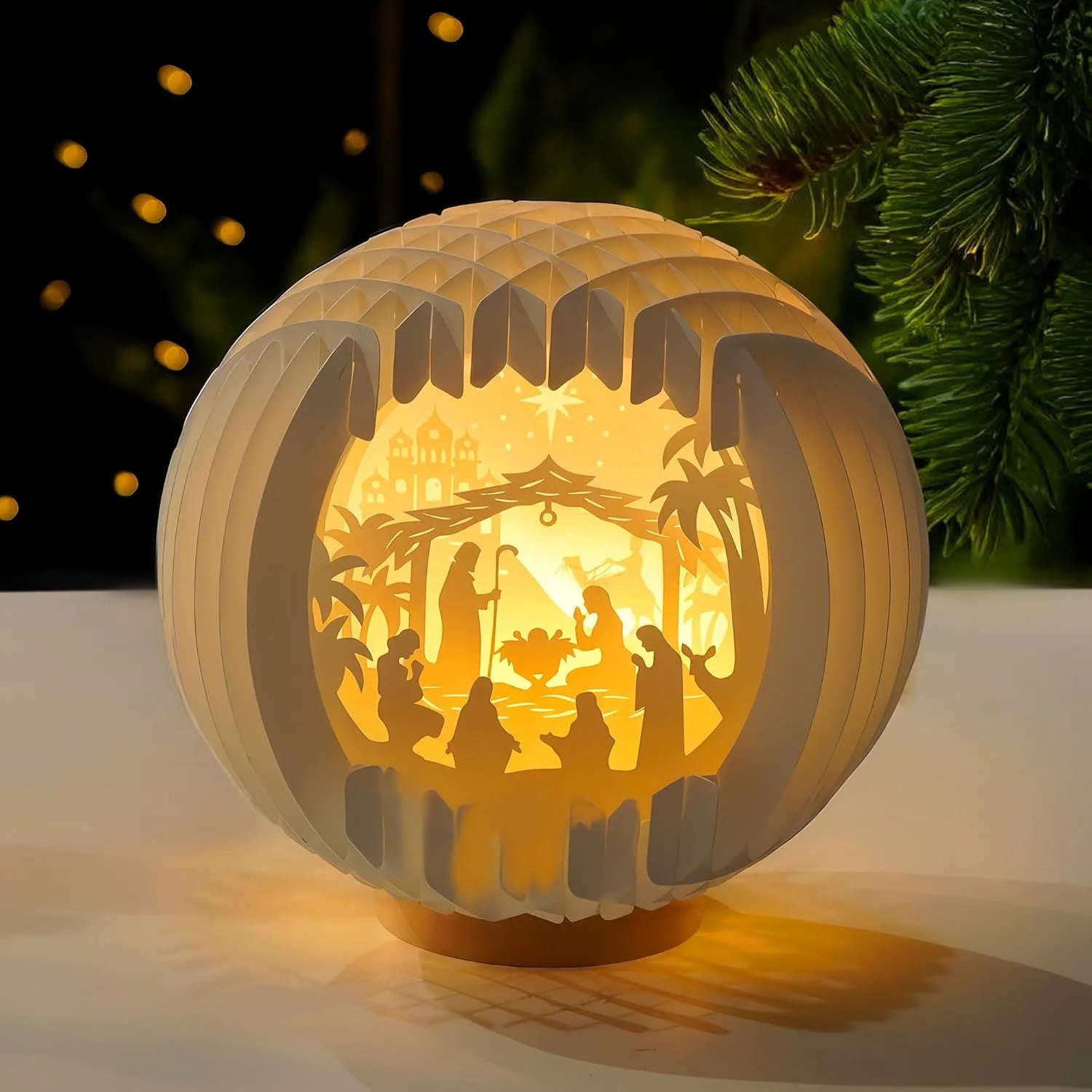 Die sorgfältig gefertigte Lampe besticht durch detaillierte Krippenszenen, ein leuchtendes Inneres und eine kugelförmige Gestalt und schafft so eine andächtige Atmosphäre für Weihnachten. - Eine Erinnerung an den Weihnachtszauber und die spirituelle Verbundenheit