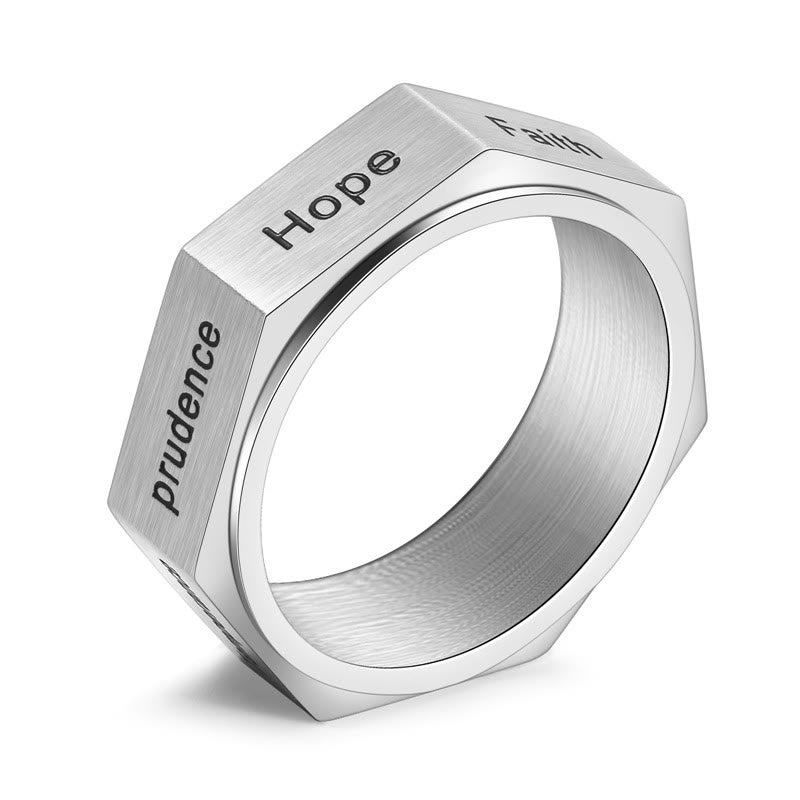 Christianartworkshop Minimalistischer Achteckring „Sieben Tugenden“ in Gold, Silber und Schwarz