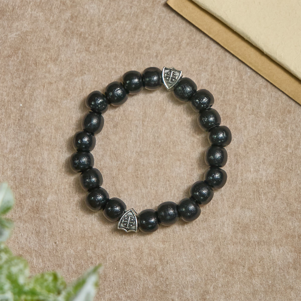Dieses handgefertigte Gebetsarmband kombiniert glatte schwarze Holzperlen mit zwei silbernen Jerusalemkreuz-Schilden – jedes ein Symbol für Schutz und die Mission des Gläubigen, das Licht Christi in jeden Winkel der Welt zu tragen.