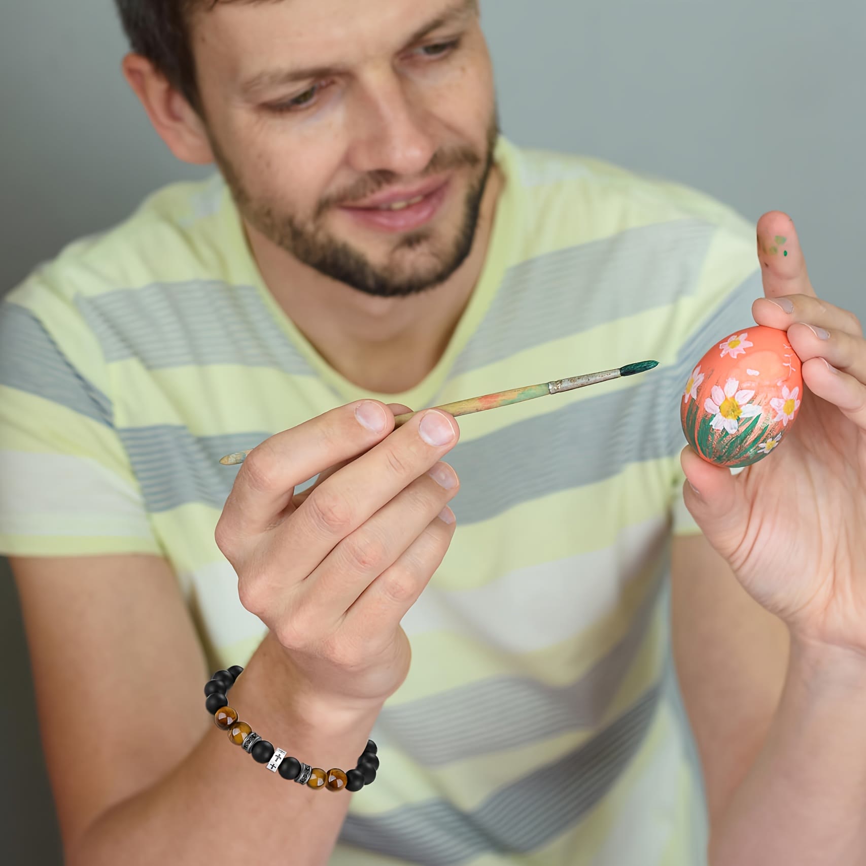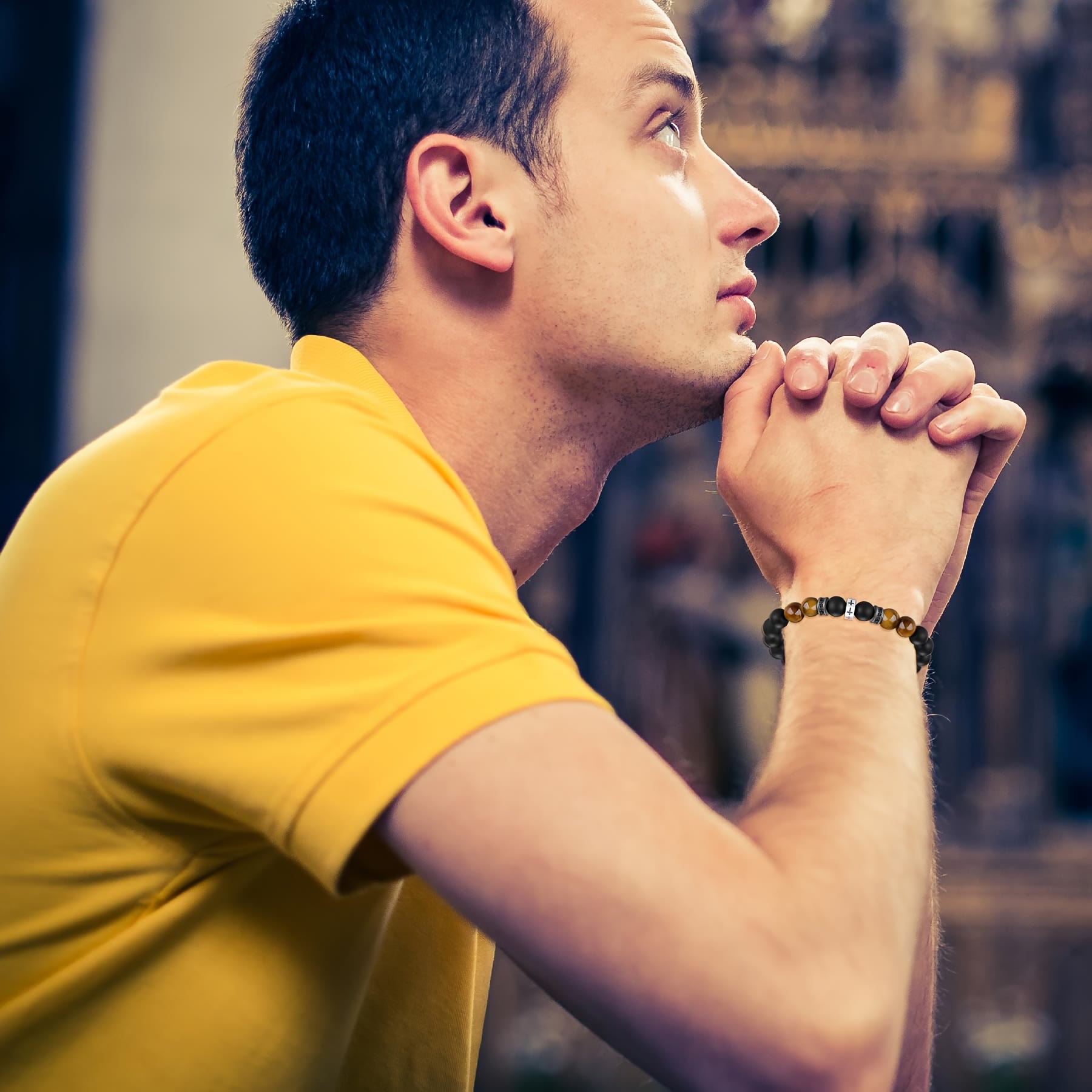 Dieses Armband mit mattschwarzem Onyx, glänzenden Tigeraugenperlen und einem Kreuzakzent ist ein herzliches Geschenk für Jungen zur Konfirmation und erinnert sie überall an die göttliche Unterstützung.