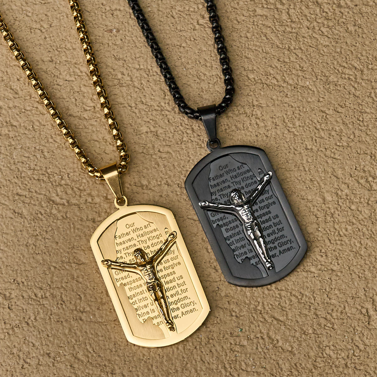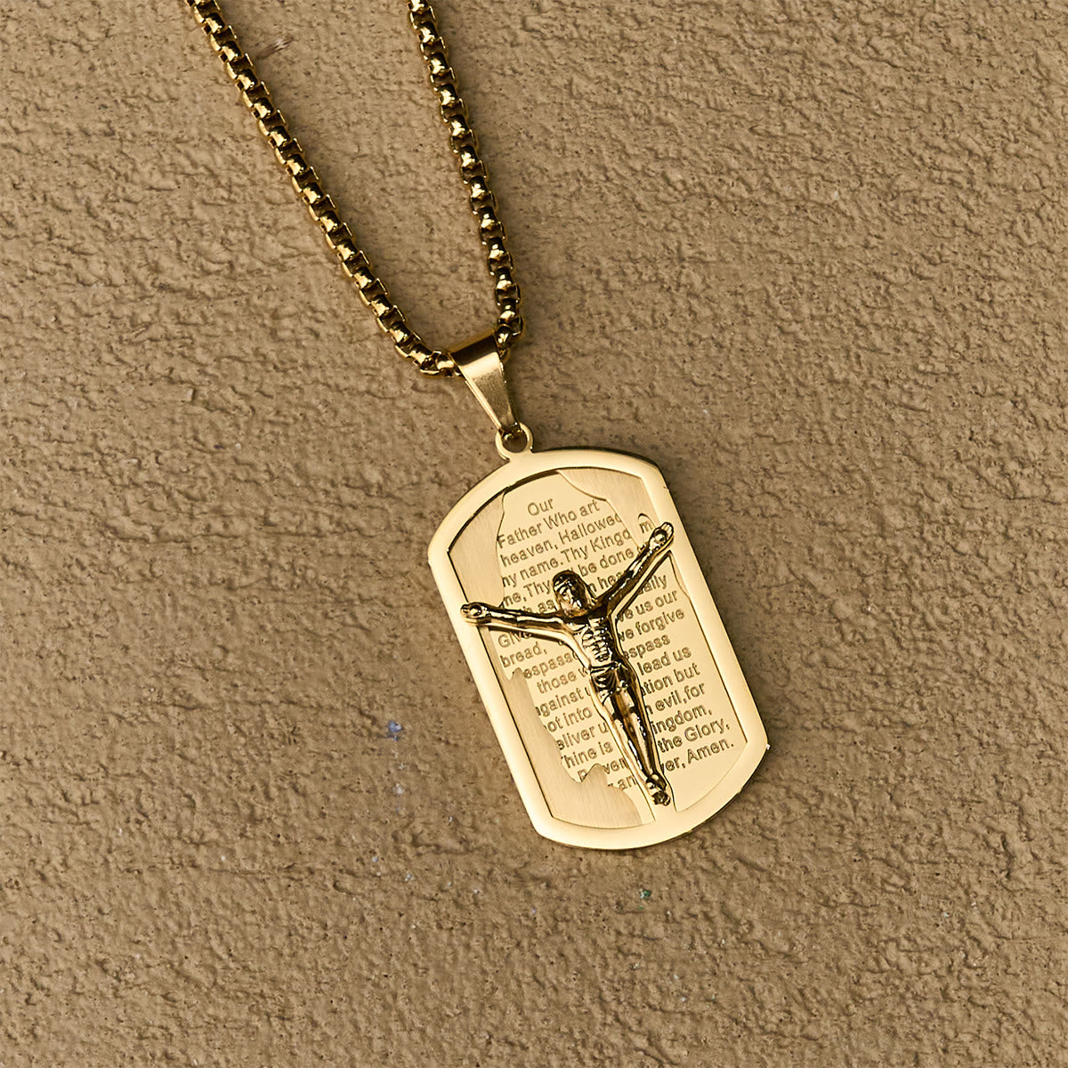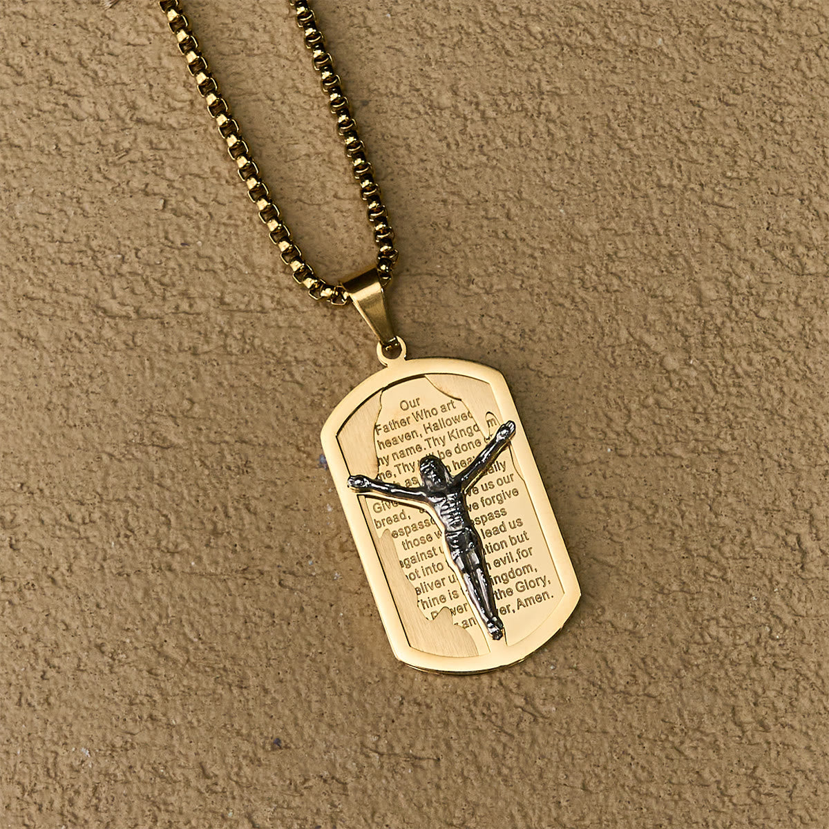 Eine moderne Halskette im Statement-Stil: Ein erhabenes Kruzifix ruht auf einer Plakette, die vollständig mit dem Vaterunser eingraviert ist – klare Linien, starke Präsenz, selbstbewusst getragener Glaube.