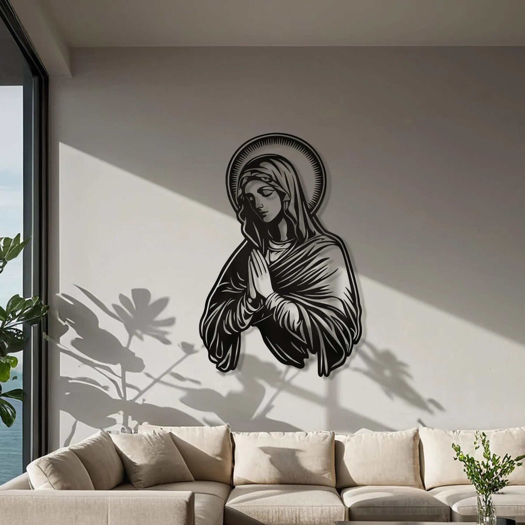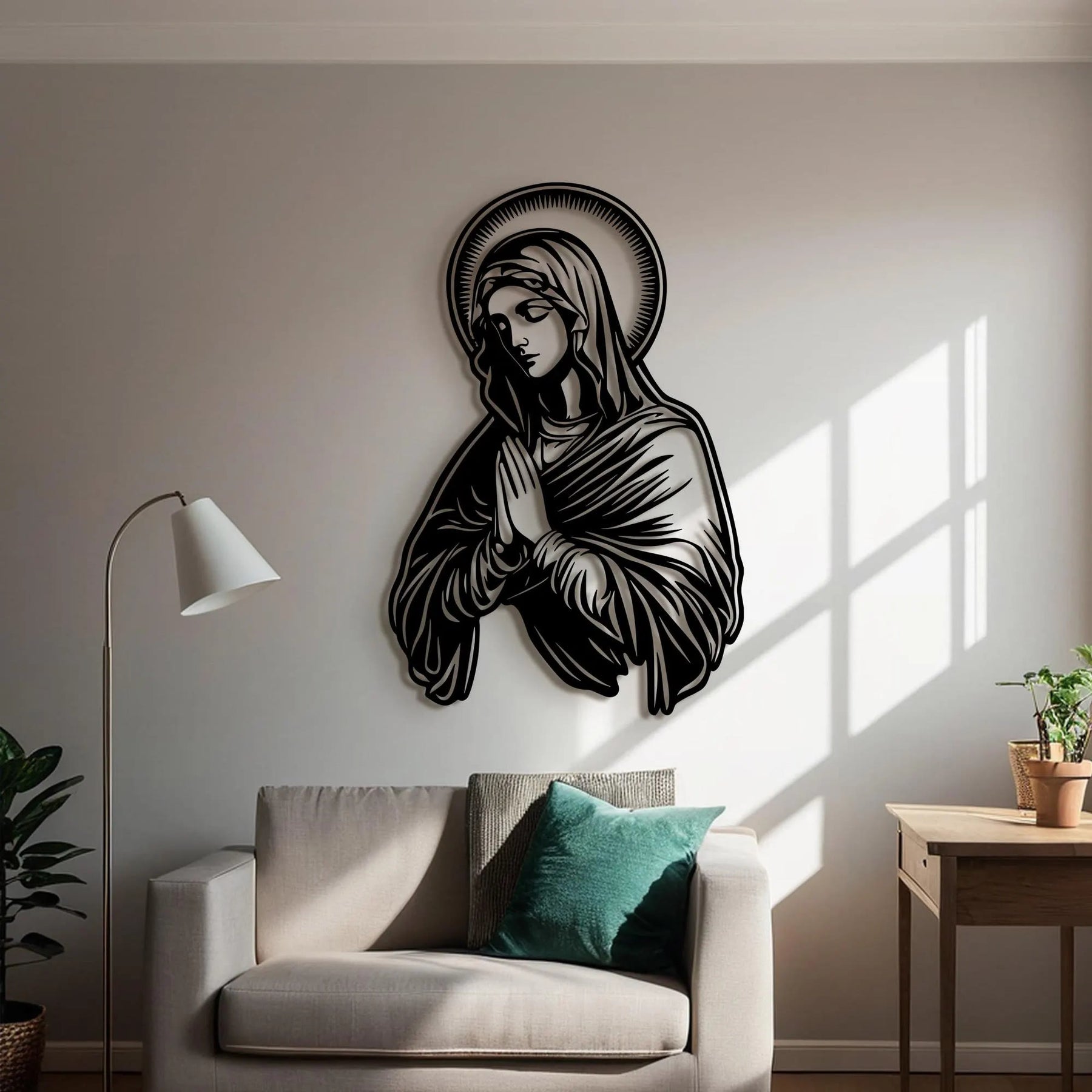 Ein perfektes Einweihungs- oder spirituelles Geschenk: Es verbindet die bedeutungsvolle religiöse Symbolik der betenden Präsenz der Jungfrau Maria mit dekorativer Eleganz.