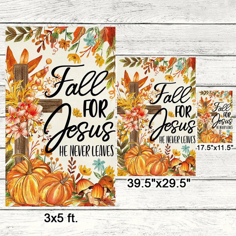 Feiern Sie die Schönheit des Herbstes und die Standhaftigkeit des Glaubens mit dieser exquisit gestalteten Gartenflagge mit dem erhebenden Satz „Fall for Jesus He Never Leaves“ – gepaart mit warmen Herbstmotiven wie Kürbissen, leuchtendem Herbstlaub, roten Kardinälen und einem Holzkreuz - Für Inspiration und saisonalen Charme geschaffen