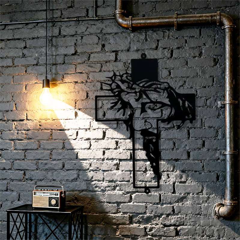 Es ist fachmännisch aus hochwertigem Metall gefertigt und wird präzise geschnitten, um die scharfen Konturen der Jesusfigur, der Dornenkrone und des Kreuzes hervorzuheben. Die glatte Rostschutzbeschichtung widersteht Korrosion und behält gleichzeitig sein elegantes, poliertes Aussehen. Die Kanten werden sorgfältig verfeinert, um eine sichere, edle Haptik zu gewährleisten. Robuste Konstruktion und künstlerische Raffinesse verbinden sich zu einem zeitlosen Schmuckstück für Ihr Zuhause. - Erhöhen Sie Ihren Glauben - Centered Space