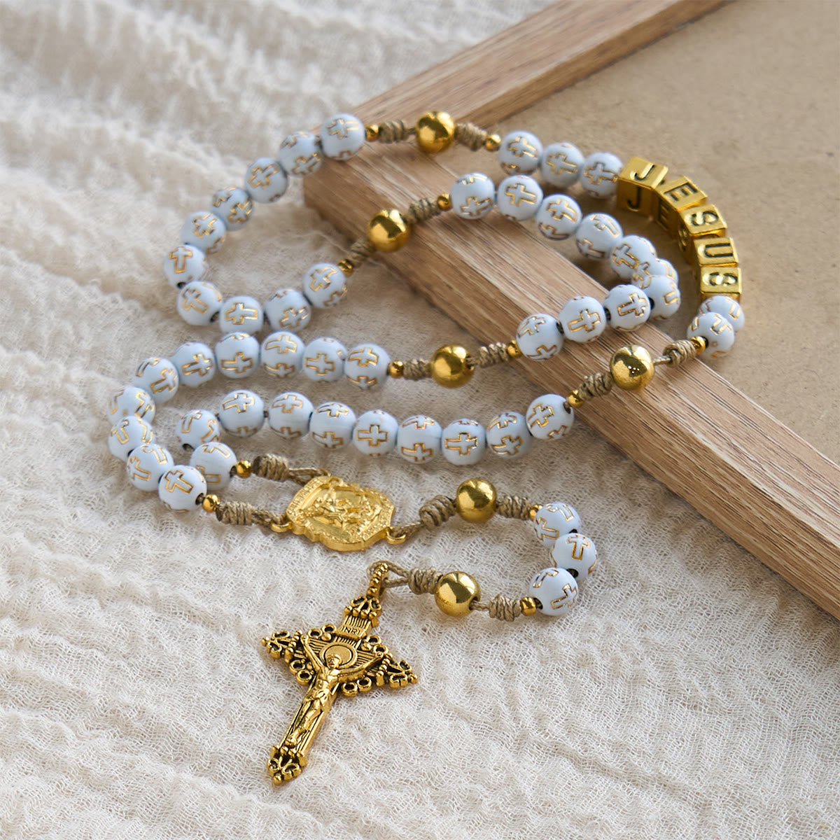 Durch die Kombination zeitloser religiöser Symbole (das Kruzifix, der Schriftzug „JESUS“) mit Elfenbeinperlen dient es als geschätztes Gebetsinstrument und bedeutungsvolles Geschenk für diejenigen, die beide Glaubensrichtungen pflegen.
