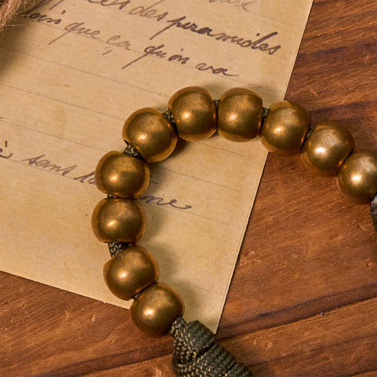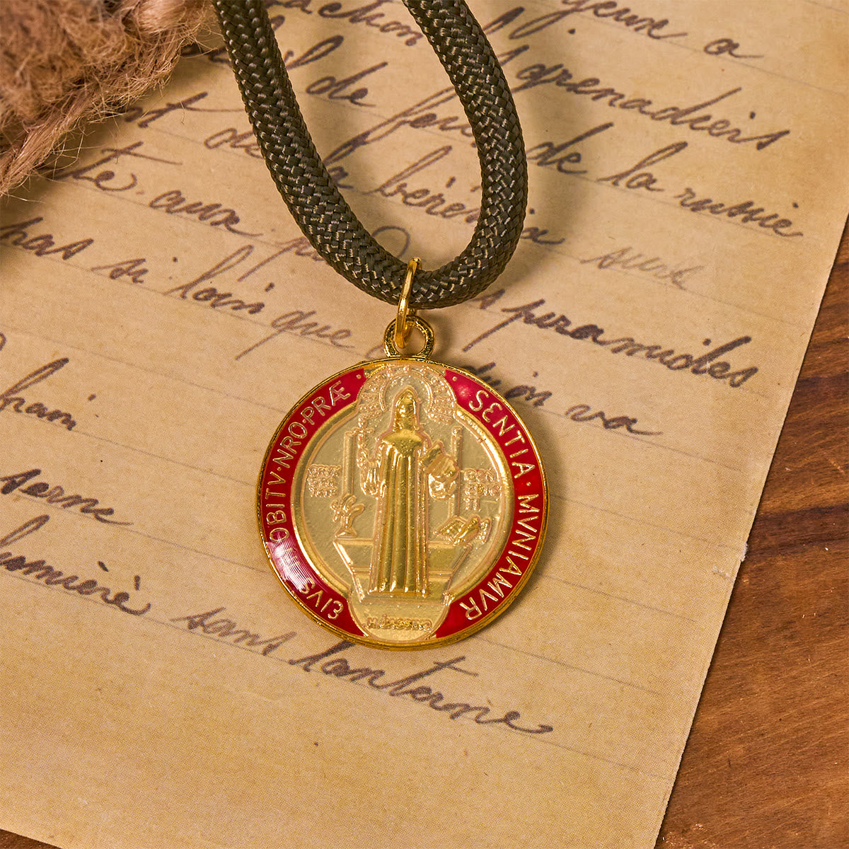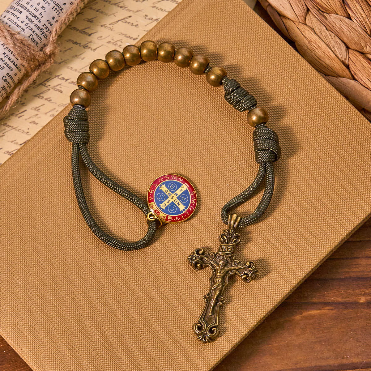 Dieser Rosenkranz aus bronzefarbenen Perlen und strapazierfähiger Nylonschnur vereint Widerstandsfähigkeit und Tradition. Die rot-blaue Benedikt-Medaille setzt einen heiligen Mittelpunkt für Mut und Heiligkeit.