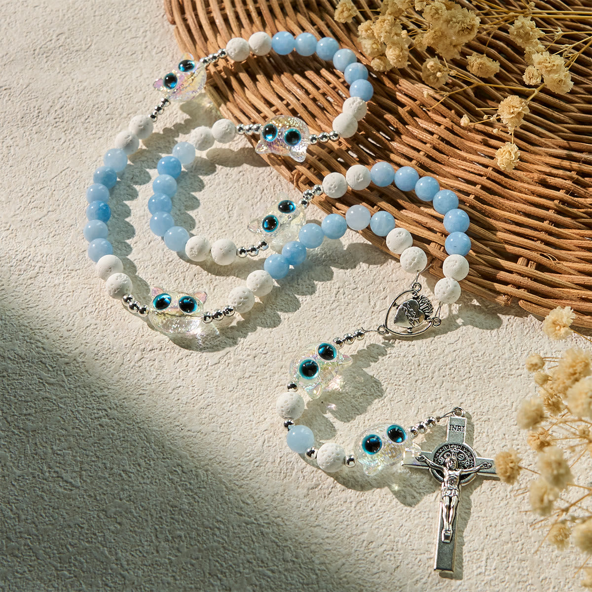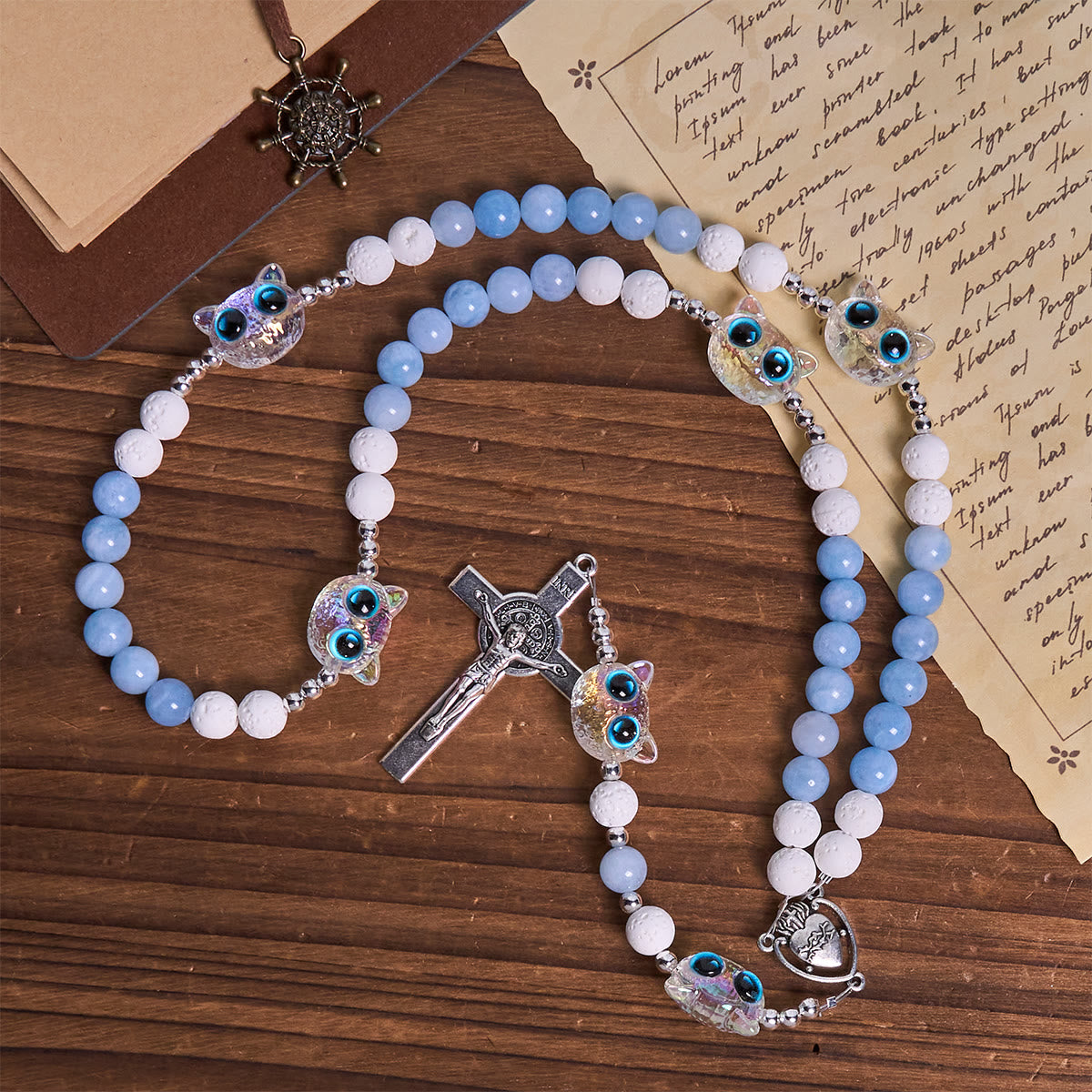 Christianartworkshop Glas-Katzensegen mit Aquamarin und weißem Lavastein, Gedenk-Tierrosenkranz