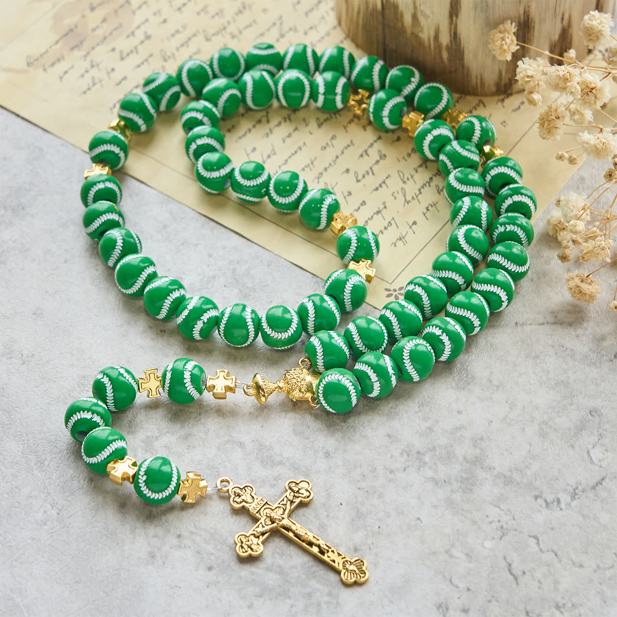 Dies ist ein kompaktes, kraftvolles Symbol des Glaubens, maßgeschneidert für Sportler und Sportliebhaber. Mit kleinen Perlen im Baseball-Muster und einem goldenen Heiligen Kelch und Kruzifix verbindet dieser Rosenkranz die Liebe zum Spiel mit der Kraft des Gebets. - Geschaffen für Glaubenskämpfer
