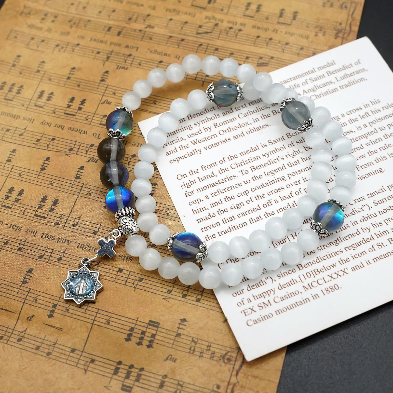 - Symbole, die sprechen: Die Kurve eines Kreuzes, die Linien einer Benedikt-Medaille, die Schleife eines Rosenkranzes – das sind nicht nur Dekorationen. Sie sind Sprache: Das Kreuz flüstert „Erlösung“, Rosenkranzperlen sind „Schritte im Gebet“, die Worte „Glaube, Hoffnung und Liebe“ spiegeln 1. Korinther 13 wider. Sie sind leise, aber lauter als Worte – Erinnerungen für dich und sanfte Zeugen für die Welt.