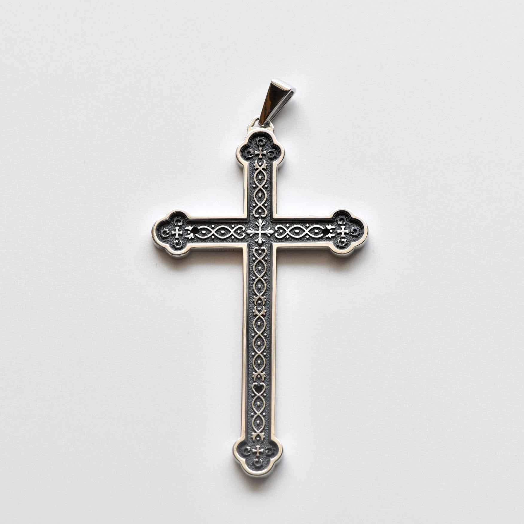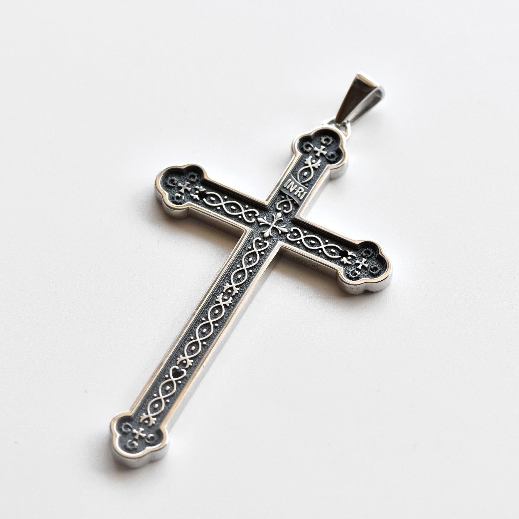 Ein Retro-Kreuz aus Sterlingsilber trägt die INRI-Inschrift – von der Zeit gezeichnete Buchstaben, die das souveräne Opfer Christi flüstern. Geschmiedet als greifbares Zeugnis unerschütterlichen Glaubens. - Sterling Patina, Ewiges Echo